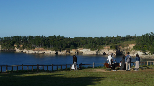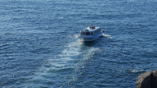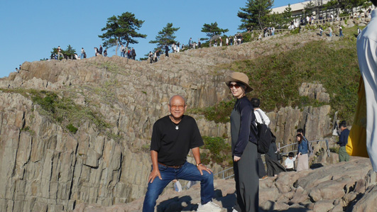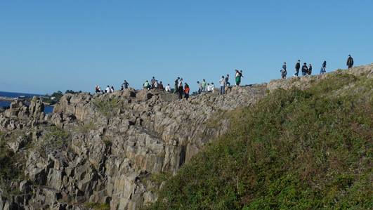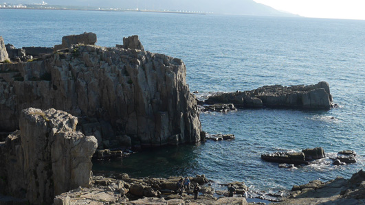 | 天候(晴れ) ![]() 東尋坊の海岸線 断崖の上に黒い人並みが! ここは名勝「東尋坊」です 世界三大絶勝「東尋坊」は溶岩によってできた巨大な柱状の岩が 海岸線に沿って約1kmに渡って続く絶景だ 福島から600km車を走らせ。。。足を踏み入れた恐怖の断崖です ![]() 道標の前にて! 名勝(東尋坊) 予定時間より1時間遅れて到着です駐車場は満車状態だ 誘導員に案内されて空きスペースに車を止めた ![]() 断崖絶壁 打ちつける白波 秋晴の好天に誘われてか?多くの観光客で賑わっています 早々に店中を通り抜けて恐怖の崖に下りました ![]() 崖の上の二人 足元は切れ落ちています 真っ青な空に縁どられた二人は岩の上に立ち笑顔を見せるが怖そうでした チョット安心な良い足場を見つけて私も写真に! (笑) ![]() 遊覧船 柵があれば余裕(笑) 絶壁の下にある観光船乗り場からは遊覧船が忙しく出入りしています 柵のある所へ行き大展望を楽しみました ![]() 恐怖の崖に人波 広場から東尋坊の崖 崖の上には監視員が観光客の動作を見守る姿があります 転んだら崖下まで落ちるような場所にもかかわらず 観光客の歓声が聞こえてました 探索を終えた私たちは之から宿へ直行です (笑) 動画をご覧くださいね! 戻る |