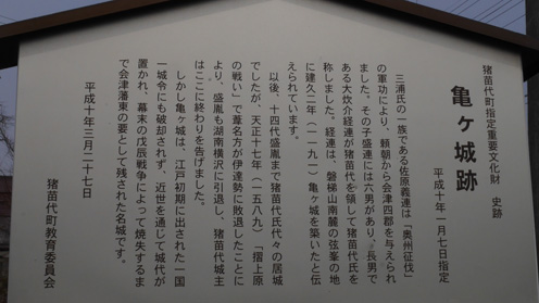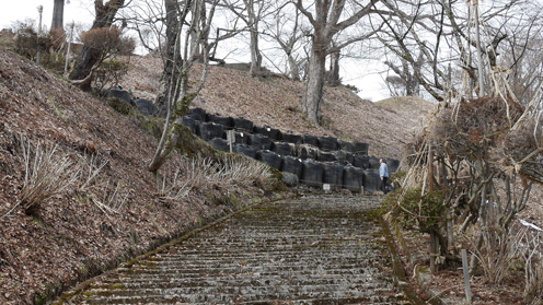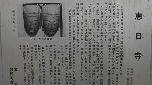 ![]() 磐梯山 49号線を走り猪苗代町へ入ります 目指すは恵日寺だ ![]() 恵日寺 境内 経路案内板 駐車場へ入り資料館の在る境内へと進みます 資料館は冬季休館中でした ![]() 寺の歴史 金 堂(伽藍) 恵日寺は平安時代 奈良の東大寺 興福寺の僧だった 高僧「徳一」が造った寺です 徳一は重要なキーパーソンで会津の寺を語る時には必ず出てくる名前である この恵日寺で会津の仏教の基礎を作り上げました その他に勝常寺や法要寺などを手がけ 会津一円に仏教を布教する大きな役割を果たしました ![]() 本 堂 山 門 境内を進み石碑が並ぶ村内を歩くと本堂へ着きます 本堂では法要が行われる様で礼服姿の村人が並んではいってきました ![]() 磐梯神社 御手洗場 緩い坂道を登って行くと磐梯神社です 由緒ある神社と一目でわかるような門構えで身が引き締まりました ![]() 神社鳥居 社 殿 村人の五穀豊穣と安全を祈願されてる門柱があります 石段を登り社殿へ行くと人の姿が在ります 社務所の方と思われる数人が忙しく動いていました しめ縄が祀られている拝殿まで進み参拝を済ませた ![]() 乗丹坊 墓塔 案内板 案内路の↑に沿って進むと墓塔があります 案内板には僧兵数千人を動員する勢力の衆徒頭の墓とありました ![]() 薬師堂案内板 薬師堂 薬師堂にはもともと薬師如来像が納められ 会津五薬師の一つ 東方薬師として多くの信仰を集めた ![]() 亀ヶ城跡 石碑 史跡案内 恵日寺を後にして来た所は亀ヶ城跡です 此処は以前から石垣と高台に何がるのか気に成って居ました ![]() 亀が城跡 野口英世 像 苔生した石段を進むと土留めに使われている土嚢が積まれています 崩れかけた石垣の修復が待ち望まれている光景を目にしました 広場に着くと目に飛び込んできたのは人物の銅像です 誰だろうと刻まれた文字を読むと猪苗代の偉大な博士「野口英世」先生でした ![]() 城跡広場 雪吊り 全てを歩いてみようと城跡を探索いたします 一旦西側へ下り回り込むように歩くと登り返しの道がありました 再び高台まで登り返すと・・・ 広場の木は雪吊りで養生され折れない様になっていました 広場で映した一前の写真 磐梯山を背に飛びあがるような姿が滑稽ですね! (笑) ![]() 稲荷神社 石段と鳥居 駐車場まで下りてから隣りに在ります亀ヶ城稲荷神社で参拝です 磐梯山麓にはまだまだ凄い歴史が残されていることに感動いたしました 動画をごらんくださいね! 戻る |