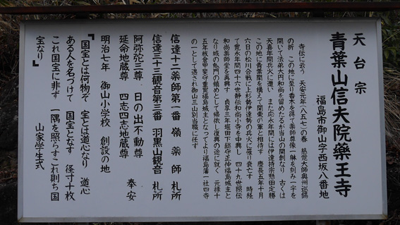 ![]() 市内より信夫山 初めて信夫山へ来ました 4号線から見える山は正に福島のシンボルです ハイキングコースに在る神社仏閣は・・・ 地図で確認できるだけで8ヶ所あります(実際は未だ在ると思います) ![]() 第二展望台駐車場 信夫山より市街の風景 第二展望台の駐車場に車を止めて歩き始めました 眼下には福島市街を眺めることが出来ます ![]() 電波塔に在る三角点 電波塔 駐車場から北へ向かって進むと電波塔に着きました 近くに在る三角点を見つけて触ります (笑) ![]() シュンラン 柚子の木 ハイキングコースには柚子の木がいっぱいありました 実は採らないのか地面に転がっています あ~~ もったいない ![]() 羽黒山大鳥居 ハイキングコースの旗 お花畑の在る所に出ると羽黒山神社の大鳥居が現れた 開園150周年の旗が靡いています ![]() 羽黒山 本 殿 坂道を登り切ると羽黒山の本殿があります 朱色の建物は由緒ある神社の歴史を感じました ![]() 大わらじ 境内の祠 境内には福島わらじ祭りで奉納された「大わらじ」が祀られています 近くには供養されるわらじが並んでいました ![]() 猫 稲荷神社 猫 供養写真 参道を下りて行くと猫稲荷神社が在ります 社務所に立ち寄り御朱印を受けました ![]() 祠の仏像 蝋 梅 祠の中に祀られている仏像を拝観すると! 何か不思議な力を感じました ![]() 参道にある道標 ![]() 月山 湯殿山(案内板) 参 道 信夫山の西に進むと月山と湯殿山神社へ着いた 道標に沿って竹やぶの道を登ります ![]() 月 山 湯殿山 5~10分歩いて登ると「わびさび」を感じる社がありました 祀られている御霊に手お合わせる (合掌) ![]() 薬王寺の案内板 薬王寺 お堂 なだらかな山の斜面にお墓が見えます 坂道を登って行くと薬師寺の本堂に辿り着きました ![]() 大平山偏照院 三重塔(お堂) 一旦下り車道に出て寄ったところは「大平山偏照院」です 三重塔や斜面に見えるお地蔵さんの姿が圧巻でした ![]() 弘法大使像 黒沼神社(大鳥居) 弘法大使の立像や不動明王はじめ地蔵様が参道に並んでいます 此処のお寺様の歴史を詳しく知りたくなりました 最後に寄ったのは黒沼神社と護国神社です ![]() 護国神社 本 堂 参道正門に在る鳥居を潜り社殿へ行き参拝を済ませました 社務所の中に入り御朱印とお札を受けます 初めて来た信仰の山「信夫山」の魅力を肌で感じる一日でした 約3時間の拝観と山歩きで体力と感性を授かる 感謝の気持ちを大切に! 合掌 動画をごらんくださいね! 戻る |