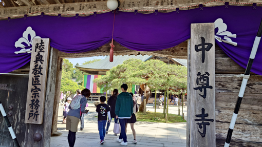 ![]() 中尊寺 本堂 中尊寺金色堂 建立900周年 藤原まつりの時に偶然に来ました 今日が春の行事が行われることは知りませんでした ![]() 金色堂900周年 月見坂を登る 3日にはこの祭り最大の「源義経公」東下り行列が行われます そんなことは つゆ知らず来たのだ (笑) ![]() 本坊表門 本殿へ 参道を登り中尊寺までの途中に在る 社に回り参拝です ![]() 本堂境内 鐘突堂 中尊寺の法要儀式の多くが行われる根本道場です ![]() 東北大本山(天台宗) 釈迦如来坐像 堂内には日本の天台宗開祖伝教大師最澄が 千二百年前に灯した「不滅の法灯」が護持されています ![]() 本 堂 社務所(御朱印) 本堂内に初めて入り参拝をいたしました ![]() 参拝者で賑わう境内 芭蕉道標 境内を一周する様に回ります ![]() 金色堂入口 金色堂 金色堂の拝観券発行所に寄り入場券を求めました 撮影禁止の為に記録写真はありません! ![]() 白山神社 十二支歳守護神社 白山神社では十二支の守護大神に行き 干支の猪の社で合掌です ![]() 藤原まつり 参道を埋める参拝者 お祭りの行列が来ました 神楽太古の音色に合わせて歩く子供の姿が厳かでした 偶然の巡り合わせに感激の参拝です (合掌) 動画をごらんくださいね! 戻る |