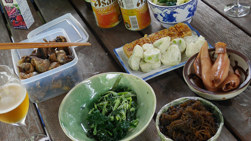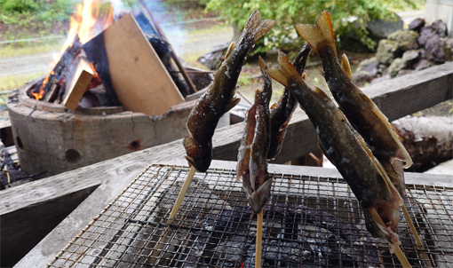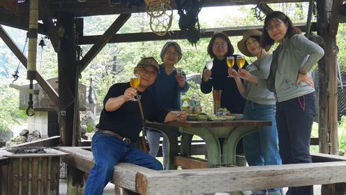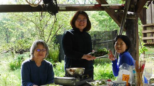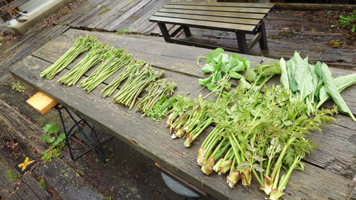 令和7年5月17~18日天候(大雨~曇り~時々晴れ) ![]() 船明神山 (登山道界隈) 山菜を採って仲間と楽しみましょうと山へ入りました 土曜日の午前中は大雨で山菜取りは中止です ![]() 登山道にあるコシアブラ 結構あるある 船明神山の登山道界隈にはコシアブラが多くあります しかし少し大きくなりすぎた感はありますがご飯には最適だ 短時間で袋がいっぱいになりました ![]() 山小屋から見る白布山 ワラビを採る 土曜の午後になると雨も上がり・・・ 山菜採りに夢中です 此処は山小屋の広場でワラビが並んで出ていました ![]() 良いワラビだ 沢のわきでヤマワサビ 太く柔らかい食べごろのワラビを次々と収穫できます 沢の脇にはヤマワサビが斜面を埋めていました ![]() コンフリ フ キ コンフリは天麩羅にするとモチモチとした触感で美味い山菜だ フキはまだ小さいが食べれば美味い!(笑) ![]() ヤマワサビ 採りたて山菜 ワサビの葉や茎を採りワサビの漬物を作りました 香り良く辛みが舌に広がる絶妙の味です 外では採りたての山菜をテーブルに並べて品評会だ タラノ芽は大きくなりましたが一番芽で柔らかく何の問題もない極旨です ![]() 雨あがる 東小屋でカンパイ 雨が上がり青空が見えてきました 料理を作る前に喉の渇きを癒しましょうとカンパイです ![]() コシアブラご飯 ワラビ灰汁抜き 最初に出てきたのはコシアブラご飯だ 毎年食べてる大好きな物で之をアテに飲むと進みますよ~ (笑) そしてワラビの灰汁抜きをします ホダを取り鍋に入れて重曹を多めにふりかけ熱湯を入れる 落し蓋でワラビが浮かないようにして1時間で美味しい物が出来上がります ![]() 山菜の天ぷら テーブルに並ぶアテ いよいよ山菜の天麩羅を作ります 揚げたてのものを食べるのが一番の御馳走だ テーブルには青森からのお土産が並んでいます 一番手前の青いものはワサビ漬けで今年初めて成功しました (笑) ![]() 沢で釣りあげたイワナ 小屋に咲く花 炭火焼の魚は沢で釣りあげたイワナやヤマメです 5時間以上かけて焼き上げるために毎年好評だ ![]() 新緑の山小屋 裏庭に咲くタンポポ 冬の景色 埋まっていました 大雪で埋まっていました山小屋もすっかり姿を表しました 之からは雑草との戦いが始まりますが! 美味しい山菜やキノコがいっぱい出てくるので一生懸命に養生します 青森や仙台からの長旅の参加でしたがキノコの季節も 一緒に楽しみましょうね~ (笑) 動画をご覧くださいね! 戻る |