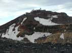 観測所のある剣が峰を写真に治めるため小屋の後ろに行くが付近は立っているのが困難でシャッターを切るがブレる