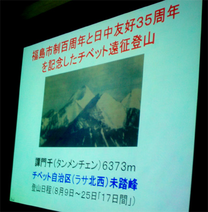 北日本海外登山研究会にて講演 東海大学K2登山隊 隊長(出利葉 義次 氏) ![]() 隊長(出利葉 義次 氏) ※ 記録へリンク(山岳部50周年記念事業) タンメンチエン 6373m 福島市政100周年事業・日中友好35周年事業 2007年8月9日〜25日 ![]() 報告者(高橋 庄衛 氏) ![]() 最高到達地点にて記念写真 パーテーの席の一コマ ![]() ![]() ![]() 隊長(尾形一幸) 登攀隊長(秋葉信夫) 装備(中沢武夫) 医療(下山田安廣) 気象(森谷裕之) 輸送(大友保夫) 記録通信(高橋庄衛) 食料(沓沢正昭) エージェント:日本未踏峰倶楽部(代表 : 伊東 亨) 山形県山岳連盟創立50周年記念 2007年9月14日〜10月23日 ![]() 報告者(粕谷 俊矩 氏) ![]() ![]() ![]() ※ 現地からの報告へリンク 北日本海外登山研究会 (隊長 : 保坂 昭憲 氏) ![]() ※ 保坂先生のHPへリンク (会議の経過) 他 戻る |