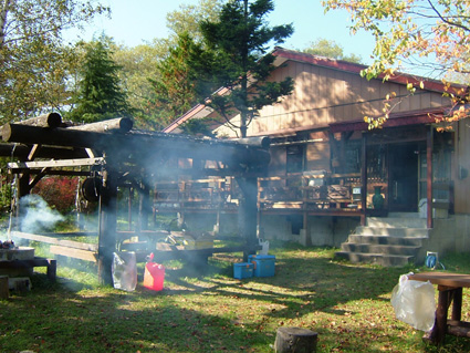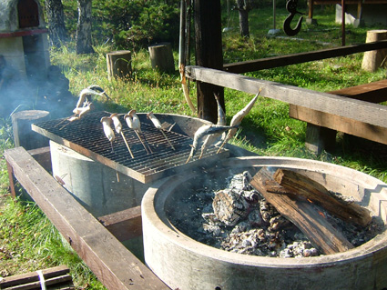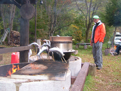 | キノコ汁の鍋の脇にはマスの塩焼き → | ![]() |