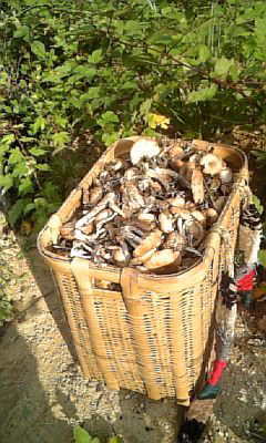 木の株に張り付くナラタケ林 ご覧のように篭いっぱいに成りました