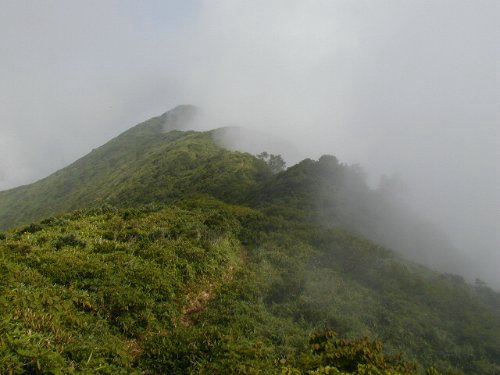 久しぶりに登ってきました。この夏、最後のヤマです。 行ってきたのは、下郷町 流石山〜台倉山〜三倉山です。 敬謙なブッダである小生は、12〜13日にお墓参りを済ませ13日の夜、雷と豪雨の中、 登山入り口の観音沼公園まで行き車中泊。 翌14日に登山口まで、向かう。途中、砂防ダム工事の箇所あるも工事期間外で通行 可。ヨロイ沢を過ぎると道は、豹変しLEGACYのお腹に気を使いながらノソノソと進む。 気合で林道終点までたどり着く。 〔山行詳細〕 ●林道終点出発 6:14 古の古道を進む。前日の大雨のせいか、川になっている箇所がある。 ●鏡沼入口通過 6:18 鏡沼入口手前に一里塚を発見。昨年9月に三本槍岳を登って時には、 無かったような気がするが... それと一里塚の→十米の意味と松川街道の意味がわからず??? ●大峠 6:37〜6:40 1445m(標高参考値) 軽く汗を流した後、到着。何時来てもここからの展望とお花は、 疲れを忘れさせてくれる。 流石山の前々々峰くらいの直前の山を登る。一応、道はあるが両側の笹に隠れて足 元は見えない。昨日の大雨が笹にたっぷり残っており 靴下から短パンまでビッショリ。 へーへー言いながら振り返ると那須連峰の三本槍岳、朝日岳、茶臼岳がガスの中か ら凛とした姿を見せる。最初のピークにたどり着き尾根歩きなるころ深沢湖がはっき り見えるようになる。これ以降は、下草が刈られ歩き易い。 ●流石山 7:30〜:38 1775m(実際は、1813m) この手前からお花畑が連続する。ここを過ぎた直後にギボウシの群落があった。本 来なら展望がいいはずであるが、あいにくガスで時おり大峠方向が見えるくらいである。 ●五葉の泉 8:06 流石山からいったん、50mくらい下る。サンショウウオとかいるらしい。この辺り は、池塘である。周囲に誰もいないせいかちょっと、不気味である。 ●大倉山 8:20〜:32 1850m(実際は、1885m) あまりアップダウンも無く淡々とたどり着く。相変わらずのガスで視界が利かない が足元の花で気を紛らわす。 ●三倉山 8:45 いわゆる三倉山前峰である。通過。 ●三倉山本峰 8:58〜9:18 1855m(実際は、1888mと標識にあり) 三倉山からは、いったん下り登る。燧ヶ岳の俎ーから柴安ー間ほどきつくないが、 一旦下って登るのは、損したような気になるのは,私だけか... 展望は、いいはず。晴れていれば... しょうがないのでやけ飯とする。ついでに雉狩をして本体の軽量化をはかり運動性 能を向上する。 下山の詳細は、省略します。 ●林道終点到着 11:57 1325m 〔まとめ〕 ガイドブックにあるように花が多くオオバギボウシ(紫)、タカネマツムシソウ (青紫)、ミヤマアキノキリンソウ(黄)、イワオトギリ(黄)、マルハダケブキ (黄)、ハクサンフウロ(赤紫)、ヒメシャジン(薄紫)、オヤマリンドウ(紫)等 がありました。一部、名前が怪しいのもありますのでご了承ください。 トータルで見ると比較的安全に尾根歩き可能でお花も多いので family登山にお勧めです。 ただし、観音沼公園より先の林道が工事で通行不能となる為、どこまでクルマで入 れるか確認する必要があります。万が一、観音沼公園から林道終点まで歩くと2時間 30分程度かかるでしょう。(約8km) ![]() P8140018:ガスに煙る三倉山及び三倉山本峰 ![]() P8140021:秋の花、オヤマリンドウ(まだ、早い) ![]() P8140042:花が開いているオオバギボウシ(多い) ![]() P8140053:マルハダケブキ こともあろうにデジカメの電池切れ(出発時の未確認が原因)で余り、写真が取れま せんでした。m(__)m 以上、長ーくなりましたが山行でした。 折笠 仁 Hitoshi Orikasa |