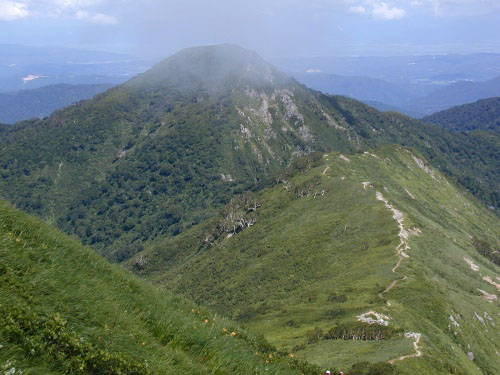 下山開始後、急に天候が回復。振り返ると大朝日岳や西朝日岳が顔を出し始めるで