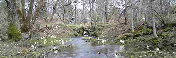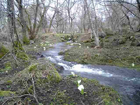 ミズバショウの咲く渓流は春の日差しに燦々と輝き