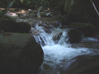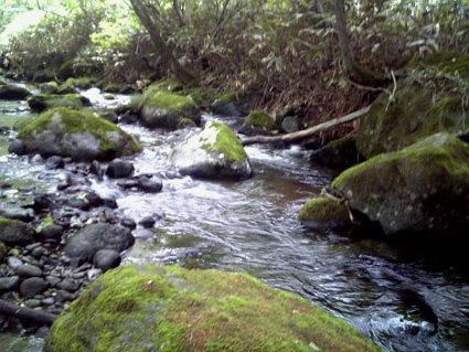 適度な斜面を見つけて渓流に下りようとしたところ、足をあげた岩がゴロリ