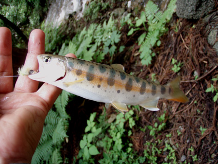 ![]() 雨上がりの渓流 可愛い花ですね! 猪苗代町にある○田川に出かけました 雨上がりの沢は渓流釣りに最適と林道を進み目的地に着くと、なんと先客が・・・・ 仕方なく先に進みます・・・ん〜〜 ・・・またしても・・・・2台目の車が・・・沢には釣り人・・・撃沈です まさかここから先にはと思いきや・・・ギャハハ・・・上にも・・・・ダメだ〜 最後の手段と枝沢に入りました 本流から外れると小物が多いですね・・・リリース物が悪戯いたします 平日にも係わらず釣り人が多いのは何でか・・・? その中の一人がSeiでした・・・(笑) ![]() 最初に釣れたヤマメ ![]() 何でヤマメが出るの・・・・? ![]() 渓流のお花さん ![]() 今日のイワナ&ヤマメは小ぶりです ![]() 釣り上げた合計は9匹でした 戻る |