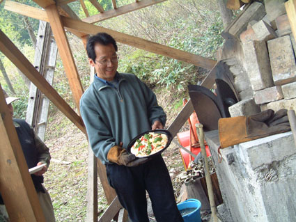 早く食べたくて見守る面々風情のある釜は味を保証してくれる