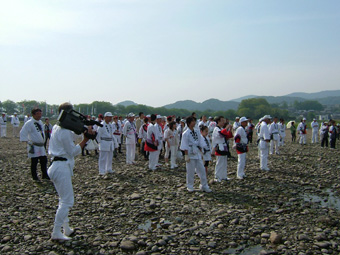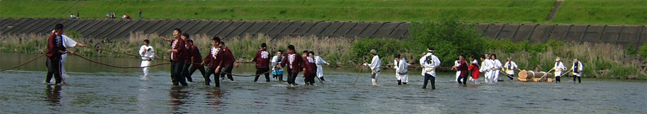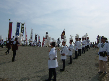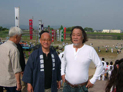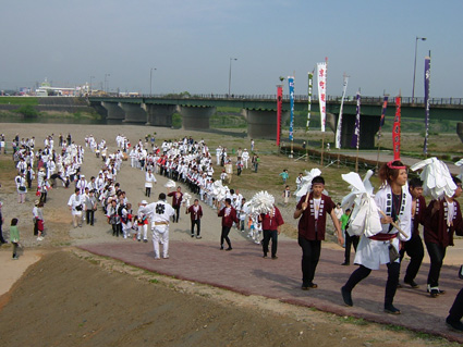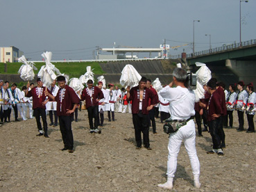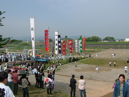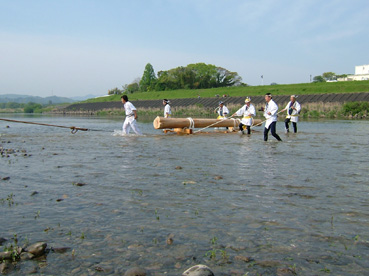 ![]() 第62回伊勢神宮 式年遷が平成25年に迫ってきました 伊勢では今年 重要な遷宮行事「お木曳」が盛んに行われて居ます 伊勢人が中心となり 新しい社殿のご用材を宮域内に運び入れる行事です 木を乗せた「奉曳車」を大勢で綱を曳き運びます 「木遣り歌」で気を揃え ”エンヤ エンヤ” と曳きます 車の車輪の軋む「椀鳴り」の音が市中に響き渡って 伊勢人の血がたぎる誇らしいお祭りです 三重県伊勢市字治中之切町(赤福十一代目店主) 濱田典保 様の文面より抜粋しました ![]() どんでん場の様子 SEI と Mr・Nakamura ![]() 用材の水揚げ場、 川曳き、 ![]() 木遣り唄を歌い曳き上げる 堤防に並ぶ常磐第一奉曳団 ![]() 御杣始祭で伐りだされたご神木は、約1週間かけて、伊勢へと運ばれ 、内宮用は神宮式年造営庁職員らによる川曳き、外宮用は地元奉曳団代表達による陸曳きで、伊勢神宮に奉納され ご神木を迎える伊勢市では、陸曳用のお木曳車を外宮から出発地点の度会橋まで運ぶ「のぼせ車」が行われて 地元奉曳団代表ら約500人が、ちょうちんを飾り付けた奉曳車を曳き、木遣り歌とともに練り歩きます ![]() 「どんでん場」