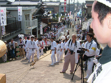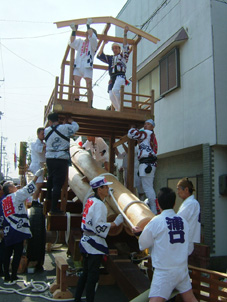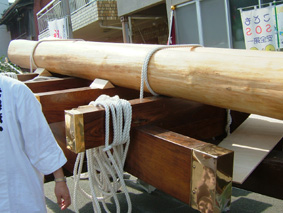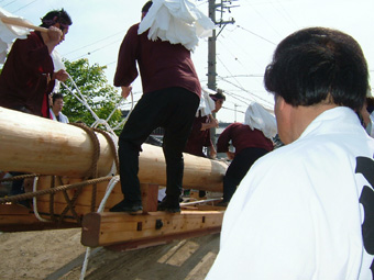 宮川の川原から特設の堤防の頂上 「お木曳」行事が終われば、この特設の「どんでん場」は元の宮川堤に戻されます。 「どんでん場」は引き揚げた用材の水を切るために堤防(宮川堤)に上げ堤防を挟んで両側から綱で引き合って 用材を上下に大きく振るうための場所でお木曳き前半の見せ場の一つです。 ![]() 御杣始祭は、20年に1度のご遷宮に際して、御杣山(みそまやま=遷宮で使う用材を伐り出す山)から 御樋代木(みひしろぎ=ご神体を納める器をつくる用材)を伐り出す重要なお祭りです。 皇大神宮用と豊受大神宮用に選ばれた天然ヒノキのご神木2本の前に祭場が造られ、 まずはお祓いや供物、祝詞の奏上、小工(こだくみ)による伐採の儀などの祭儀が行われる その後、ご神木は白衣姿の杣夫(そまふ=木を伐採する人)が三方から斧を入れて伐り倒す 「三ッ紐伐り(みつひもぎり)」という伝統的な伐採法により 皇大神宮、豊受大神宮の順にたすきがけになるように無事伐り倒される。 ![]() 常磐第一奉曳団とSEI やぐらを組んでる様子 ![]() 「どんでん場」から「そり」で降ろされた用材を「お木曳車」に載せ、荷締め、飾りを施します。数百メートルもある綱が2本延ばされ ”エンヤ エンヤ”とかけ声をかけて「お木曳車」を曳きます。 ※ 行事内容の詳細については・・伊勢神宮「お木曳行事」を参考にさせていただきました。 戻る |