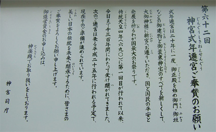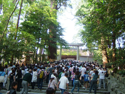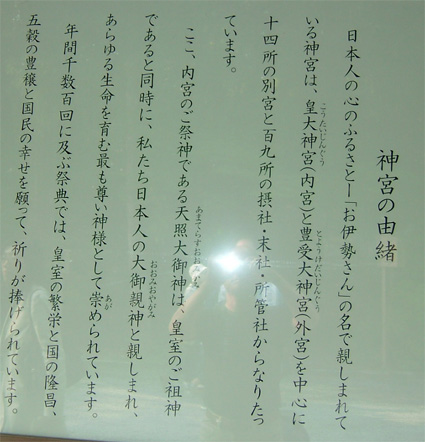 ![]() 内 宮 「伊勢神宮」は通称で正式名称は「神宮」 全国の10万を超える数の神社の中でも最高位のお宮として、 ![]() ![]() ![]() ![]() お泊まりの宿(神宮会館) 神宮前の通り ![]() 五十鈴川 (かつてはここで身を清めたという) 内宮の庭 ![]() 内 宮 (正 宮) 拝殿の様子 伊勢神宮は、主に「皇大神宮(こうだいじんぐう)」と「豊受大神宮(とようけだいじんぐう)」の2つを指します。 皇大神宮は「内宮(ないくう)」といわれ、皇室の大御祖神(おおみおやがみ=日本人の祖神)で、太陽にも例えられ、 豊受大神宮は「外宮(げくう)」といわれ、 神宮(伊勢神宮)は本来、内宮・外宮を始め 、別宮(べつぐう)・摂社(せっしゃ)・末社(まっしゃ)・所管社(しょかんしゃ)などを含めた 総数125社の総称です。この場合、伊勢市のみならず4市2郡にもまたがることになります。 ![]() おかげ横丁 昔のお伊勢参りは「おかげ参り」と呼ばれ、「おかげで元気です」という感謝のお参りでした。 ![]() ひもの塾(数種類の焼き魚の試食が出来る) おはらい町の案内板 ひもの塾は参拝者が「おかげ横丁」に買い物や食事に寄る方に声をかけ ”食べていきな” 歩きながら食べてはダメだよ! 美味しいと言って食べるが 帰りに買ってくれる人は殆ど居ない等と笑わせながら魚を焼いてたのが印象に残りました ![]() おかげ横丁の一角 伊勢名物「赤福」が内宮の門前町「おはらい町」の中ほどで約300年間 変わらず商いを続けてこれたのも お伊勢さんの「おかげ」と言う感謝の気持ちを持って 平成5年7月に誕生させたまちが「おかげ横丁」です 戻る |