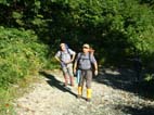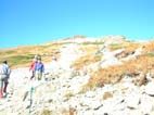 道になる 次第に傾斜が増し息切れがする 休もうとするが落石注意の看板 右の崩れた山肌では倒壊を防ぐ工事が行われていた