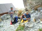 白馬尻にAM8:35到着 澄んだ空気と心地よい汗 ビールタイムの為一休み 小屋の脇では登山客が大勢