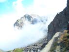 歓喜を上げ話込んでいる 小休憩を取り ガスと晴れ間の交差する登山道を登る AM9:55大雪渓に着くアイゼンを付ける