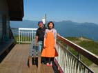 栂池山荘を後にした ロープウエーの終点でメルへンチックな建物をバックに写真を撮る