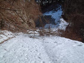 林道を2キロ程登った所に倒木があり進路をふさがれる、仕方なく空き地を見つけ、ここから登山開始、午前11:00先週とは大違いの雪の原である、30センチ位と思うがアイス板の所や吹き溜まりがあり少し歩きにくい11:20分登山口へ杉林を雪を踏みしめ登ること20分モミやアセビの木の混じる雑木林に入る。 |