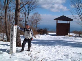 | 所々には道標があり雪で登山道は解らないが迷うことはない午後12:05山頂 に到着。綺麗な展望台があり太平洋が一望できる。同行したTさんと歓喜の雄叫び、 早速いつもの通りビールで乾杯、之がなければ登山じゃない 持ってきた★つまみ ご飯★のお供と共に40分、時間が経つのは早いものだ ソロソロ帰り支度。 |