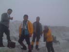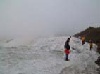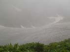 梅花皮岳山頂6:16視界10m程で記念写真を撮り烏帽子岳に向かう 稜線の夏道はすぐに雪渓