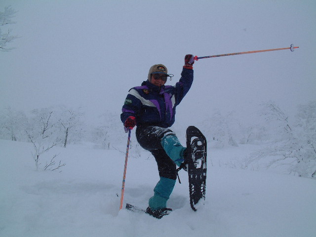 膝まで沈む 時折吹雪く中 三脚を取り出し初めてのスノーシューを付けての自分を記念に撮る