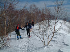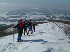 | 春を思わせる陽気に思わずヤッホーの雄叫び 猪苗代スキー場の第4リフト終点より山頂へスタート 積雪2mを越す山腹 いきなりのラッセルに悪戦苦闘のメンバー 稜線に出て一息 猪苗代の町を眼下に眺め 展望を楽しむ 磐梯山は青空に天を突き刺す勇壮 赤埴山をトラバースして小休憩の面々 |