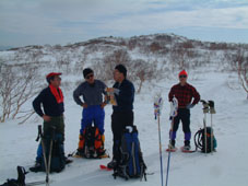| 鏡ヶ池を雪の下に眺め スノーシューの足取りも軽やかに沼の平に付く 一面が雪に覆われ山々が近くに見える 此から登る急斜面を考え 腹ごしらえと水分補給をする 見た目は其れほど角度を感じさせないのか余裕の面々 |