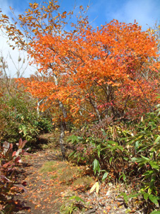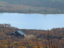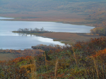 | 雄国沼の辺は 紅葉した草や木々で縁取りされてる 時間が在るときは遊歩道を廻ろう |