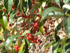 道ばたには青空に映える木の実が 赤と空の青と木の緑のコントラストが眩しく輝いていた |