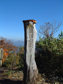 山頂の道標が 貫禄を木肌に出し 待ちかまいて居る |
