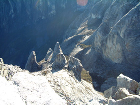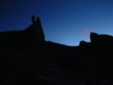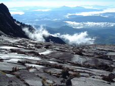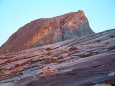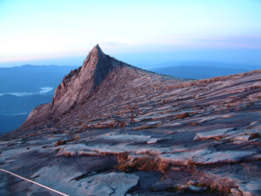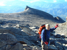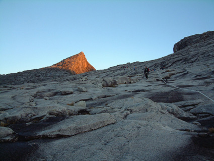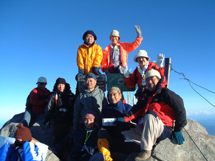 11月3日 ラバンラタ小屋をAM2:30出発(3300m)〜ロウズ・ピーク(4095.2m)にAM7:30到着 下山AM8:00〜ラバンラタ小屋到着AM9:20(朝食)〜休憩〜小屋出発AM10:30〜 ティムポホン登山ゲート(1866.4m)PM1:30到着 ![]() South Pcak(サウス ピーク 3921.5m) AM1:00起床 SEIの腹痛は治まった様である だが 体が ふらふらと力が無い このままでは山頂を踏むことが出来ないと ソーセージ一本を無理に食べる 胃の調子が悪い (>_<) ![]() 暗闇の稜線 ガイド & TETU AM2:30ロウズ・ピークを目指して出発だ 急な階段 ヘッドライトの灯りを頼りに登る まだ木々の背丈は高く展望は無い 目の前に迫る大岩 薄明かりの中に先行者の光が見え隠れしてる 一枚岩の雄大なキナバル山を踏む 期待と夢を現実の物にするために進む 体長が悪い力が入らない 意識だけが足を前に出させてる・・・ サヤッサヤッ小屋(3668.1m)にAM5:40 此処で登山者カードの 確認を求められた 厳しい検問である 「一日の許可入山者をチエック」 ![]() キナバル山の日の出 ヘッドライトの灯りも要らなくなり 歩きやすい ただ 急な一枚岩の為にロープが張られコースを外れない様にされて居る 気を抜けば滑落は間違いないだろう 確実に足場を確保して進む セントジョンズピーク(4090.7m) ![]() キナバル山 最高峰 Low`s Peak(4095.2m)への挑戦 朝日が東の空を照らし出した雲海が赤く染まる トウンク・アブドウル・ラーマン・ピークのシルイットが大岩に影絵となり浮かぶ そしてドンキーズ・イヤーズ・ピークも 太陽が顔を出す素晴らしい光景だ 広大な大地をさまよう様に歩く登山者が 夢に見た幻の様に サウス・ピークの尖った形 セント・ジョンズ・ピークの丸い形 そして憧れのローズ・ピークが目の前に姿を現した ただ興奮とピークを 早く踏みたい気持ちが先走り 回りの景色を見るゆとりが無い ![]() 山頂の登山者 ![]() 上の左から TAKE 中央 Hayasaka 右 Takizawa 左から ガイド・SEI・Takizawa・TETU・KEN ガイド 写真を撮ってるのは Furuno ピークには先行者の姿が多く見ることが出来た AM7:30到着 此処がキナバル山の山頂と大きな声で自分に語りかけた 感激の瞬間である 先行のKENさん・TAKEさん・HAYAさん・TAKIさん ご夫婦に続き TETUさんとSEIが拍手と握手で向かえられた オメデトウキナバル山 有り難うマレーシア最高峰キナバル登頂 体調不良にも係わらずピークを踏めた事に 今までにない 満足感を味わう事が出来ました ![]() 氷河期に削り取られたと伝えられてる山容 下山(余裕のTETUさん) 30分位の休憩の後に下山 一枚岩には白のロープが張られて迷う事は無い 下山時は回りの風景や遠望そして大地の肌を じっくりと堪能する事が出来 余裕の歩きに成る ![]() 巨大な一枚岩の山様 畏敬の念を起こさせる山並み 雲が沸き上がる様に押し寄せる そして消える 風がささやく耳元で 帽子が飛ばされる風のいたずら 心が笑う子供の様に 全てが達成された満足感なのか 山頂付近ではTETUさんのカラスの鳴き声 力が無く 高山病に係ったカラスとみんなの笑いを誘った 順調に下る アクシデントが一度在ったが怪我も無く全員無事にパナール・ラバン小屋に着く 時間の関係で到着後直ぐに朝食を取り 小屋を後にした 山頂の雲一つ無い空間 広大な岩の山 高山植物の数々 平地の温度(30度)と山頂の温度(1〜8度)の温度差と 今まで一度も経験できなかった自然に感謝して キナバル山の道を楽しく下るハッカ山苦楽部の面々でした 4日目を終了 次のページに続く |