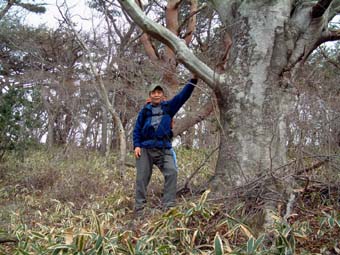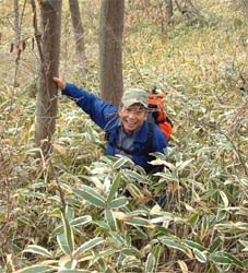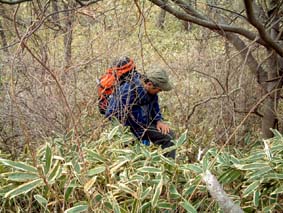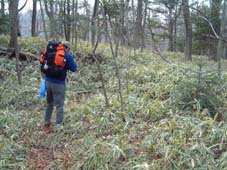 ![]() 登山道を登るTETU 一面の笹 閼伽井岳の山頂で