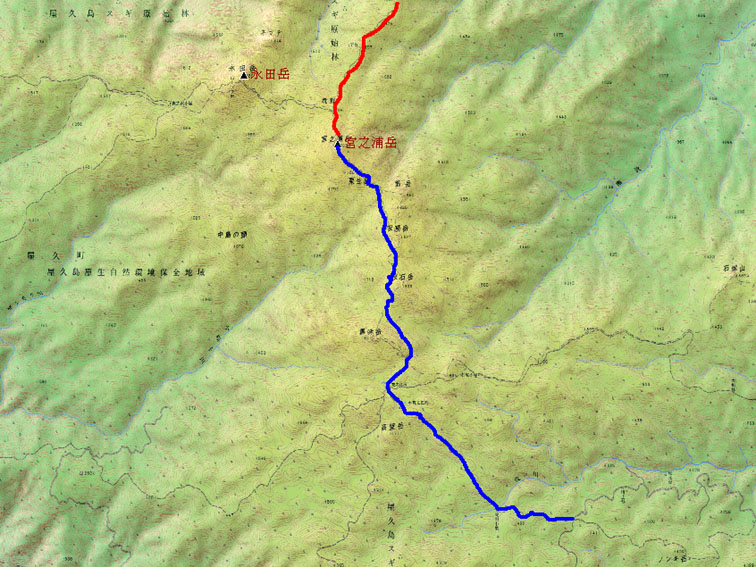 今回のコース 青〜赤が縦走コース(淀川小屋より13時間) 淀川登山口〜淀川小屋(泊まり)〜花之江河〜宮乃浦岳〜小高塚山〜縄文杉〜 三代杉〜小杉谷事業所跡〜荒川登山口