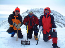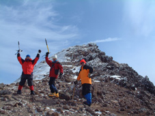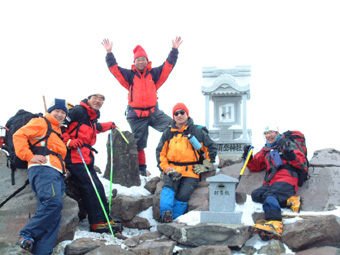 ![]() 大丸温泉を出発する 左からHIRO・ARIGA・KEN・Sho・TAKE 峠の駐車場より朝日岳 ![]() 茶臼岳を左に雪原を登る 稜線に見える峰の茶屋 小屋より望む 左が剣ヶ峰 右に朝日岳のピーク ![]() 那須連邦の奥に 南会津のシンボル燧ヶ岳や三岩岳が木漏れ日に輝いて居た ![]() 剣ヶ峰のピーク クサリ場を登る 朝日岳の肩で 左からHIRO・Sho・TAKE ![]() 茶臼岳 中央に三本槍岳 右奥に須立山 ![]() 朝日山頂で左からTAKE・HIRO・Sho ![]() 稜線越しに福島県のシンボル磐梯山が浮かぶ ![]() 茶臼の外輪を歩く 茶臼岳の山頂で 左からARIGA・KEN・TAKE・HIRO・Sho 全国的に曇りとの予報の中 栃木県大丸温泉からコースを取り那須岳に登る 高曇りの空 日射しは無いが山の稜線はクッキリと見える 夏道には圧雪され雪が1〜2m位あるが 安定してる 雪面は凍って居るようなので全員アイゼンを付けての登りになる 夏道を横切りどんどん登る 30分程でゴンドラの駅に着く 夏には大勢のハイカーで賑わう場所も今は誰も居ない 閉ざされた駐車場は一面雪の原で 春を待つ後わずかな時間を大切に大地一杯に呼吸をしてる様に見えた 朝日岳を正面に見ながら進むと 峠の茶やが軒先まで雪に埋まり未だ来ぬシーズンに一休み 石の鳥居を過ぎると やや登りがきつく成る それもわずかな距離で終わり 間もなく茶臼岳の山腹を巻くように緩斜面を登る ケルンの在る場所まで来ると正面に峰の茶屋が確認出来る 此処は強風の吹く場所で有名 去年の今頃訪れた時に私は強風に飛ばされて怪我をした場所である。 今日は雪は締まっていて歩きやすく風は殆ど無い 今時期には珍しい!! 峰の茶屋には登り初めてから一時間四十五分で着き小休憩 間もなく鋭いピークの朝日岳に誘われて登り始める TAKE・HIRO・Sho・SEI 剣が峰は夏道は通れずピーク越え 30度位のガレ場を登りピークに在る目印で写真を撮った 安定しない足場を一歩一歩下り コルに出る 雪の残る岩場は要注意 クサリの張られた登り 切れ落ちたエッジ スリルと興奮の通過に遠望を楽しむには余裕が無い (>_<) 道標の在る稜線に出ると間もなく朝日岳の山頂まで15分位で着く 無風の高曇りの天候に遮る物は無く 流石山の峰峰 三本槍の勇壮 白く輝く磐梯山 南には燧ヶ岳や三岩岳と視界に飛び込む 20分間 山頂は極楽の天童に ときめく心をなだめて下山 私は剣ヶ峰の夏道を下る が 40度は在ろう斜面の雪は腐れ初めてて 雪がアイゼンに張り付く 滑る 前進を諦めて剣ヶ峰のピークを目指し直登 滑る岩場は恐怖ものでした・・ 峰の茶屋で食事に 持参したワイン・ビール・ウイスキーと持ち寄った食材は テーブル一杯になり一時間のランチタイムでした 後半の目指すは茶臼岳 黙々と上がる噴煙は圧巻きだ アルコールの入った体は正直で運ぶ足は鈍く 息が切れる TETUさんの気持ちに成った(笑) 山肌は至る所から噴煙が上がり冬ならではの光景と新鮮な大気は茶臼岳の特権か 山頂の祠に手を合わせ無事に下山の途に着く 茶臼岳の冬の近道 夏には下れない雪原下り 峠の茶やを目標にガンガン下る 他のメンバーがケルンを巻いて下った為に 早く着きすぎた SEI は暫し一人で 駐車場で待つ事に成りました 初登山のARIGA君 ピッケル&アイゼン初のShoさん お酒好きのTAKEさん 堅実なKENさん 元気なHIROさん 今日も楽しく登れました 有り難う・・・・SEI