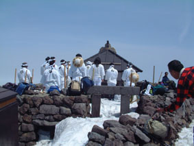 宿坊の皆さんが山頂に在る神社でお参りをしてた