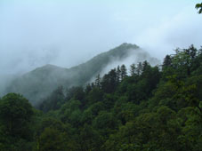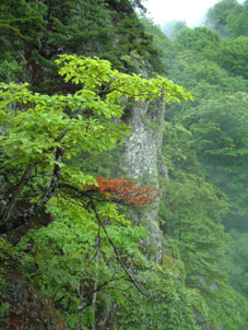 ガスの中から現れた一筋の滝 一枚岩の滑の流れは雨のもたらす 技なのか それともブナ林の伏流水か!! |