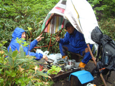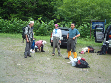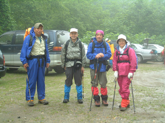 ![]() ![]() 小雨の中出発 TETU・KAZU・Sho・TAKI 屋久杉の株の様な根 ![]() 大きな根の前でSho・TAKI・KAZU・TETU TETUさんの見開いた目が不気味(@_@) (笑) ![]() 生き生きと草木が蘇る梅雨の季節 登山道には多くの草花が咲いてた ![]() 空気が 木々の保水が美味しいと軽快に登るKAZUさん ![]() 小田代にてKAZU・TAKI・TETU 木道の上で湿原に咲く花を覗く登山者 ![]() 避難小屋の前で宴会が始まる 帝釈山への道標 ![]() 小屋に在った脚立で簡易テントの出来上がり ![]() 舞鶴草 ![]() シャクナゲ ヒメシャクナゲ ツルコケモモ?? ![]() 湿原の花達 時草 ワタスゲ ![]() 全員無事に下山 ![]() 駐車場より峰は望めない(雨上がりのP) 小雨降る中 郡山を出発した 羽鳥湖の湖面は穏やかで梅雨の中休みに山の緑を水面に映しだしていた 田島を通り舘岩の部落に差し掛かると道路脇に駐車してる多くの車が目立つ 立て看板に釣り大会の案内 渓流には太公望が所狭しと並んでた 小雨がぱぱらつく砂利道の林道 猿倉に向かう車か!!前方に数台走ってる 落石注意の看板を横目に大小様々の落石が見受けられる 新緑の瑞々しい木々の葉 霧雨の中で踊るように爽やかな揺れ 楽しみながら高度を上げ進むと猿倉登山道入口の駐車場に着いた 駐車場には数十台の車 準備を整いて登って行く登山者 見上げれば山の姿は無く 小雨を降らす雨雲で被われていた 小川を渡り登山道の取り付きを登る 初めから勾配を稼ぐ道 濡れてる登山道は滑り足場が悪い 大きな木の根の在る場所で休憩 林で被われてる為に展望は無い ただ小さな花が足元に咲き乱れ 十分に話題を提供してくれてる TAKIさんの図鑑のごとく出てくる花の名前 聞いても忘れてしまうSEI (>_<) 小田代に着くと多くの登山者が湿原の花に引き留められていた 数種類の花が手をつなぎ咲いてるのが印象に残る ワタスゲの花が水分を含みボール状に成り頭を垂れていた。 急登を登ると田代湿原が広大な平面に広がる ガスで遠望は利かないが足元の花や水分の含む美味しい空気が 田代の楽園にようこそと出迎えてくれました。 避難小屋に着き私達は飲食の準備 KAZUさんとTAKIさんは 軽く食事を取り帝釈山へ足を延ばす 私達はシシャモを焼きビールでカンパイとくつろぐ 次から次と来る登山者は良い香ですねとシシャモの焼くにおいに引かれ 私達の場所を覗きこむ ご一緒にと初対面の登山者と食を共にした 午後一時三十分に帝釈山から二人が帰り 再び避難小屋で食事をする 十時半から十四時十分の下山まで長^^^い山頂滞在でした 下山は足早に降り十五時十分 全員が駐車場に到着 皮肉な天候は下山と同時に太陽が顔を出した !(^^)! 帰り道 湯ノ花温泉で汗を流し 田島町で美味しい蕎麦とビールで 満足の満腹 Shoさんは帰路の運転のため大好きなビールが飲めない 美味しそうと横目で覗く 次の運転はしなくて良いと慰め 飲む仲間 皆さんが素晴らしい一日でしたと語り合い駐車場で別れました Shoさん家まで送って頂き有り難うございました TETUさんKAZUさんTAKIさん Shoさん 田代〜帝釈の花の旅 思い出を有り難うございました ・・・・・・・SEI・・・・・・