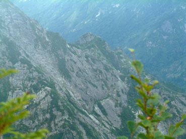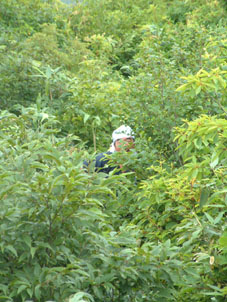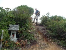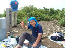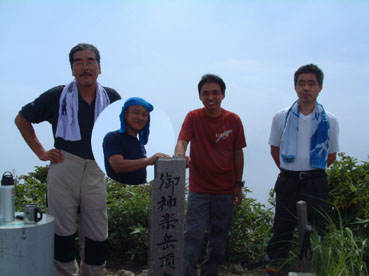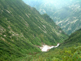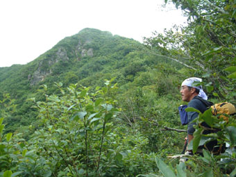 → → 登山口とKEN 八乙女の滝 渓流のクサリ場 → ![]() 途中でワラビを採るKEN 稜線に出た杉山ヶ崎 → ![]() 杉山ヶ崎への稜線 避難小屋(200m下に清水が在ります) ↓ ![]() 本名御神楽岳に着いたKEN & 伊佐須美神社の祠 ↓ ![]() 御神楽岳で疲れたSEI ↓ ![]() 藪越えが一時間ぐらい続く稜線 ↓ ![]() つばくろ尾根 ↓ ![]() 本名御神楽岳とKEN ↓ ![]() 山頂に咲いてた花 ↓ ![]() 残雪の谷底 ↓ → ![]() 熊打場の絶壁(クサリ場)を慎重に下る 前ヶ岳を右手に急坂を!! ![]() 山頂で左からKEN・SEI・今井さん・島津さん 今井さんと島津さんは山頂で会いました新潟の方です。 しばらくぶりにKENさんと二人だけの登山になる 御神楽岳は以前にKENさんと何時かは登りましょうと話してた山である お盆休みも終盤 15日に予定したが雨の予報に16日に延期 之が正解し天候に恵まれての登山になった。 本名ダムから林道に入り悪路を進む 左に霧来沢を見下ろし ガスが垂れ下がる中 登山口に車は走る しばらくするとガスが手品師の魔法に係った様にスーッと消えて行く 消えたキャンバスには御神楽に続く峰の切り立った画面が映し出され 私達は未だ見ぬ世界へと案内された。 登山口は林道の分岐点近くにあり 私達は車を分岐点に止め 帰りの東尾根下山に有利と判断する 身支度をし登山口に行くと既に車が二台在りどうやら今日の登山者は 私達を含め3パーテーの様である 澄み切った空と渓流は心を躍らせ 軽やかに動く足は KENさんを鼻歌の奏でる行動へと導いてくれた 15分程で八乙女の滝に着く 其処からは渓流の音を聞きながら平行に進む登山道 川を流れる水の音が遠ざかると急登が始まる ブナの大木やトチの木が見事だ 左に大スラブが見えて来ると杉山ヶ崎は直ぐ其処に 地図と高度計で確認して休憩を取る 最初のピーク948mに着くと稜線越しに帰りの下山道 東尾根が見える 地図には無い登山道を下る予定のため ![]() 熊打場より東尾根 位置を確認する(藪越えと沢の取り付き位置) 尾根を一端下り 登り介すと熊打場の道標 その先には直登のクサリ場が出てきた このころから晴れていた空にガスが充満? 展望危うし そんな中 目の前に避難小屋が 既に飲みきっていた水を補給するため 最後の水場(往復400m)でタンクを満たす 小屋からはほんのひと登りで本名御神楽岳に着いた 山頂はガスで視界はなく御神楽岳の稜線を地図とコンパスで確認 ※此処から御神楽岳までの稜線は崖の切り立った藪越えで危険です 休憩もそこそこに藪越えをして御神楽岳へ 右に滑落すれば谷底は間違いない 笹や木々で足がすくわれる 足元が全然見えないストックで木々をかき分け進む 疲れがピークになる 約1時間の難関を越え山頂に着いた 先に着いたKENさんがビールを出して用意万端 バテバテのSEIはビールを飲む姿に力がない お盆休みの飲み疲れか?? 11:05に山頂に着き13:30分までの長い滞在にも係わらず 気持ちが悪く食べ物が喉を通らないSEI作ったラーメンは手を付けずじまい 元気なKENさん 冷やしラーメンや食材を美味しいと隣で食べる 胃薬を飲み横たわるSEIとは対照的でした。 気付け薬(ウイスキー)を飲んで元気になるSEI そのころと同時にガスが切れて来た 遠望とは行かないまでも谷川岳の異名を持つ 姿が此処に現れる つばくろ尾根や水晶尾根・前ヶ岳の絶壁に身も心も奪われた KENさんとSEI 新潟から来てた今井さん島津さんと共に 山談義に花を咲かせてくれた自然の造形美に感激致しました。 13:30下山開始〜本名御神楽岳で小休憩 既に14:15分下山を急ぐ 最初は此処から東尾根を下山する予定でしたが時間を逆算すると無理と判断 同じ順路を辿ることにしました 足早に下り渓流沿いに着くと私達は初めての攻撃を受ける ”何の???小さな体の○○アブ” その数と言ったら数百匹がKENさんと私に群を成して襲いかかる 真っ黒な固まりと言いば想像がつくかな〜〜と思います。 耳元で唸る羽音 止まるや否やチックと一刺し 体中が赤く腫れて居ます 二人とも虫除けを忘れました 皆さん虫除けは必ず携帯致しましょう 楽しく奥会津の懐深い神秘の山に触れる事が出来ました 山頂で会った今井さん島津さん そしてKENさん 今日の日を有り難う感謝致します ・・・・・SEI・・・・・