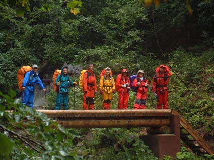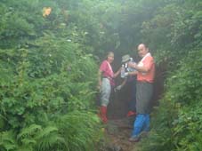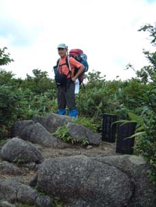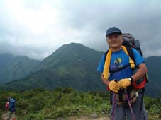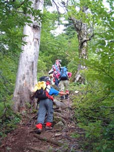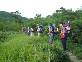 ![]() 朝日鉱泉前で TAKI・Joe・NABE・HAYA・HIRO・SUZUKI・TAI ![]() 朝日鉱泉 朝日鉱泉前から大朝日岳 ![]() 朝日川に架かる吊り橋 ![]() いきなりの急登 鳥原山の湿原 ![]() 一輪のピンクの花が崖の上に咲いていた ![]() 中央に鳥原小屋 湿原の分岐に留まるHIRO ![]() 鳥原山の山頂&HIRO ![]() 後方に小朝日岳&TAKI ![]() 小朝日岳と右に古寺山の稜線 ![]() 小朝日岳山頂 HAYA・TAI・NABE・TAKI・SEI・HIRO Joe・SUZUKI ![]() 熊越より振返り小朝日岳 ![]() 銀玉水で HAYA・TAI・HIR SUZUKI・NABE・Joe ![]() 大朝日小屋で宴会で〜〜す ![]() 24日AM6:50 小屋の前 SUZUKI・TAKI・TAI・HIRO・HAYA・NABE・Joe ![]() 大朝日岳山頂 強風と雨とガスの中 足元がふらつくメンバー ![]() ナカツル尾根(痩せ尾根を下る) ![]() ブナの巨木に張り付くHIRO ![]() 支流に架かる真新しい木橋 HIRO・TAKI・SUZUKI・NABE・HAYA・TAI・Joe ![]() しぶきを上げ下る沢水が豪快でした 総勢8名の参加により一路 大朝日岳へ 22日PM8:00郡山を出る 晴れた空 スカイブルーと大展望を期待して弾む心を抑え登山口にPM11:30に着く 夜空を眺め満天の星を指さし あれが天の川で大接近してる火星があれだよと にわか天文博士のHIROの説明 道中心地よい揺れとお酒に夢心地のSEIが ん〜〜〜〜と うなずく (^-^) 23日 AM5:00の目覚め 蕎麦めしを作り朝食 元気に朝日鉱泉登山口を朝日川に下り鳥原山コースへと出発だ!! 雲に被われた空 暑くなくて良いねと話ながら急登をグングン登る 標高を稼ぎ程良く緩やかな尾根歩きになるが 今度は金山沢へガクンガクンと下る せっかく稼いだ標高がとぼやくメンバー 沢を横切ると 登りのゴロゴロと石が並ぶ小さな沢歩きになり 登りきると鳥原山の湿原に架かる木道が現れた 山頂の湿原を左に回り込み鳥原小屋に到着 休憩をする。 小屋には管理人らしき姿は見受けられないがビール700円の張り紙を見つけ 何処にビールがあるのかな〜〜と見渡す 小屋の使用料金箱なる物が在ったので お金を入れればビールを飲めると??? 在るわけないビール騒動でした (>_<) AM10:20小屋を後にした 鳥原山への道は 階段状に道路が整備されている 有り難いことだと独り言 道路改良期日なる道標を発見 完了日が15年8月8日?と記されてる まだ出来たばかりと 改めて感心できた 鳥原山からは小朝日岳が目の前に古寺からの稜線が懐かしく目を移す あいにく遠望は利かないが薄れてた古寺のコースを思い出すことが出来た 上り下りを数回繰り返すと小朝日岳のピークへ 山頂は強風で飛ばされそうでした 山頂の窪地で昼食をとりながら 今日までは天候は崩れないはずと天を見上げるが 予想を裏切り 山頂を後にするころから雲行きが怪しく 大朝日岳は重いガスの中にスッポリと隠れてる 急な登山道を風に飛ばされながら下ると熊越の鞍部に着いた 振り返ると小朝日岳の鋭い山肌が切れ落ちて足元まで続いてた 視界が無い稜線を登ると銀玉水に着き 名水中の名水と思ってる水場に 降りてゴクンゴクンと喉を鳴らし飲み込む清水 本当に美味しいと言葉が一人で出てくる タンクを満タンにして最後の登りに付く 急登の砂走り 見上げるが 視界に入るのは目の前のメンバーの姿だけ この頃から雨と風が強くなる 胸突き八丁も無事にクリアーして稜線のケルンを過ぎると ガスの中から大朝日小屋が現れた。 小屋には15:30到着 管理人が出てきて今日は泊まる人は少ないだろうからと言う言葉にテン泊を断念し 小屋に入る 唸る風と打ち付ける雨音に小屋泊まりにして良かったねと相づちのメンバー 二階の奥に陣取り 宴会に突入した 管理人の話とは裏腹に 次から次ぎと登山者が訪れ小屋はギュウギュウ詰め 一階に行くと足場が無いほどの登山者 大朝日岳の人気を垣間見た ここからが問題だ!! 管理人がPM5;40分位に二階に来て開口一番 6時に成ったら静かにして 6時30分に成ったら寝てください ○▽□βψκμと全員がえ〜〜〜と 幾ら何でも早すぎるではないかいな??首を傾げる 山小屋での山談義 出会いを楽しみにしてる私は 管理人の横柄な態度と言葉に愕然とした 気を取り直し仕方がないと諦め所用をしに一階に下りると 秋田から来たと言う18名のグループに呼び止められ チョット飲んでいきなと嬉しい言葉 有り難うございますと甘え合流 秋田の銘酒に舌鼓 山談義に沸き メンバーのリーダーが仲間も呼んでと誘ってくれた 私が仲間を呼びに立つと 大きな声で ダメダーと怒鳴り声 見ると管理人が 後に立ち顔色を変えて睨んでいた え〜〜〜と言うと 集まると何時までも飲んでるからダメだと言うではないか(現在PM6時過ぎ) 私は呆れるやら馬鹿げてるやらで空いた口がふさがらない状況でした 秋田の○○山岳会(ご免なさい)の皆さん美味しいお酒を頂き有り難うございました お礼もそこそこに下山いたしまして失礼いたしました・・SEI 山小屋でのルールは大切と思います でも6:30分に寝てください 6時を回った時間に出会いた山の仲間と一献に!!水を差す 之って行き過ぎではと思う私は常識が無いのでしょうか残念な一時でした。 翌日風と雨の音に目覚め