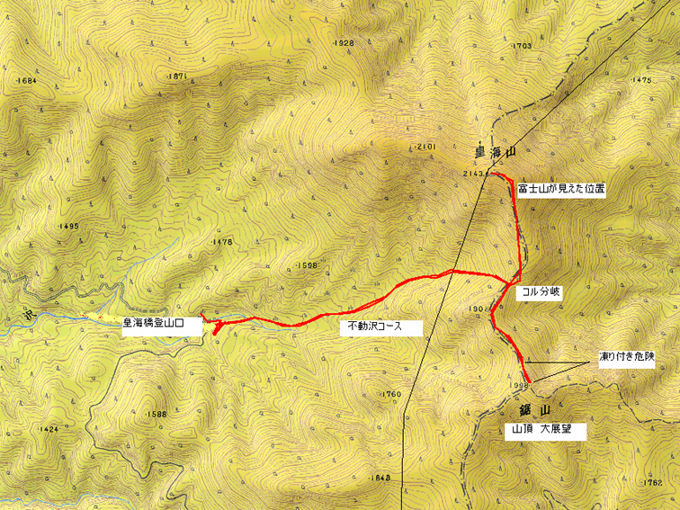 今回のコース (GPS) 戻る 登り 皇海橋登山口 AM6:03 〜 皇海山山頂 AM8:50 (休憩9:10迄) 皇海山下山 9:10 〜 コル分岐 9:45 〜 鋸山 10:40 (小休憩)〜 鋸山下山 11:50 〜 コル 11:20にて昼食(12時迄) 〜 下山 コルより下山 12:00 〜 登山口へ13:30