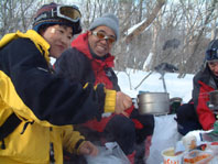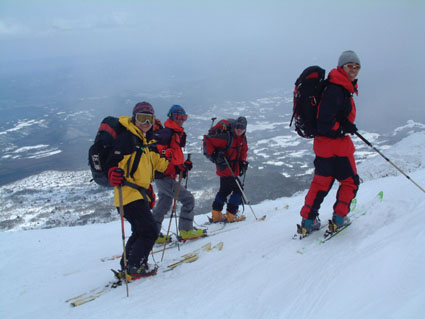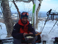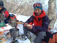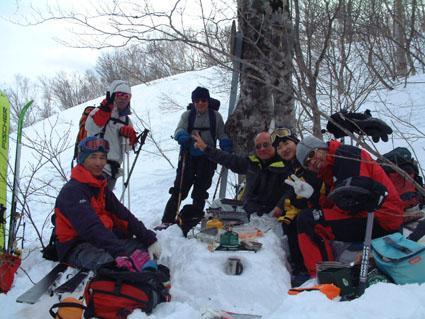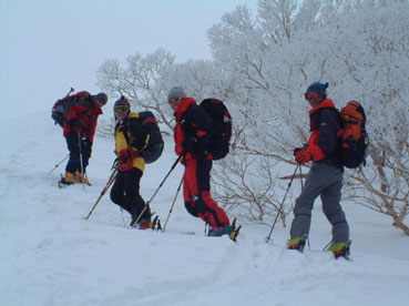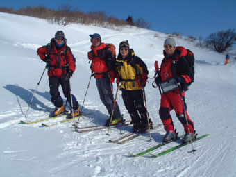 ![]() ゲレンデよりスタート 地図を見るAN!! を 待つメンバー Sho Masa すかがわ2嬢 AN (@_@) ![]() 中央は馬ノ神岳 1551m ![]() ダケカンバに強い日射しが差し込む ![]() 1362mの稜線(カシミールより) 霧氷が稜線の厳しさを諭してくれた Sho〜すかがわ2嬢〜AN〜Masa ![]() Masa・すかがわ2嬢・Sho・AN・SEI 山頂にてAM11:10 山頂からの展望は要られませんでした (>_<) ![]() 不忘の碑(中央左) 稜線にて 不忘山のピーク ![]() これより滑降開始 すかがわ2嬢・Masa・Sho・AN ![]() 中央の斜面を下る ![]() AN すかがわ2嬢 SEI Masaさん提供写真 ![]() ん〜〜〜だ〜れ こちらはMasaさん ![]() ![]() ![]() ![]() ![]() ![]() いつもの時間で〜〜す ![]() 左からMasa・宮城の人・同じく78才・SEI・すかがわ2嬢・AN 此処でも寝てる人が居た (^-^) 白石スキー場のハウス Shoさんの計画で宮城蔵王白石スキー場より不忘山(御前岳)に山スキーに訪れた 朝の内は晴れていたが山頂に着く頃はガスが立ちこめ残念ながら展望を仰ぐ事は出来ませんでした リフト終点にて山頂を見ながら準備をするメンバー ガスが動きピークが現れるのを見て今日は素晴らしい蔵王連邦の山並みを拝むことが出来ると 張り切って登り始めた ダテカンバの幹に強い日射しが跳ね返る 初めて訪れた山だが登山者が多く 愛されてる山で在ることをしりShoさんの計画に感謝感謝感謝 m(_ _)m 山頂を目指し林の中を進む 最初は緩斜面が続き皆さんハイペース 前を行く登山者のトレースが 踏み固められ歩きやすい為のハイペース??か・・・・ 雪の原に照り返す日射しが容赦なく体に浴びる 汗かきのSEIは早くも防寒着を脱ぐ たらたらとしたたり落ちる汗 ん〜〜タオルが無い 準備不足のSEIにShoさんがタオルを差し伸べた 帽子を取り稜線に出るとさすがに寒い SEI耳当てを付けて防寒を・・・ 皆さんは汗を拭くでもなく涼しい顔をして登る 元気なお嬢は余裕で何時もの足取り!! 稜線は角度を増しシールが滑る 其処でお嬢が一言 SEIさんのシールは滑らないのではと (^_-) きついお言葉 自信のシールが何故滑る 楽しい会話の中 AM11:10山頂に着きました 山頂は数個の標注があり 標注の前で写真を撮り ガスの為 見ることが出来ない峰を思い浮かべ 心の目で見ましょうと お嬢のかけ声に暖かい微風が流れるのを感じた。 休憩もそこそこに下山する事になり 麓を見渡すと斜面や灌木そして予定のコルを望むことが出来る Shoさんを先頭に木々の頭が出てる斜面を滑降 疾風のように下るSho 私もと お嬢がスーイスーイ ANさんが格好良くスッテンターン Masaさんはしなやかな曲線を描き絵になる滑降 SEIはShoさんの真似をして雪だるま 楽しい楽しい大斜面の滑降で在りました (^o^) 予定のコルを南に寄りすぎ灌木林を越える羽目になる 少し寄り道をしたが間もなく昼食の場所をセット 豪勢な野外フルコースと早変わり致しました 山頂でお会いした地元の二人が私達の宴会の席に寄ってくれた 年輩の二人にお年を聞くと 78才ですと まー元気な事 毎週 登山をしてるとのことでした 話を聞き負けじと私も60うん才ですと言うと 若いですね・・・(>_<) 本当はまだ56才です ・・ガク そんな素晴らしい不忘山 山スキーの1日に成りました 帰りに白石湯沢温泉(やくせん)に寄り 体をほぐし芯から暖まる 帰路はMasaさんの運転で 私達は相も変わらず車中宴会モード 楽しい会話のお嬢様 有り難う山 Masaさん 本当に感謝しています 有り難う山 白河夜船のANさんShoさん 車中にお酒をこぼさないようにお願いいたします ・・・来週は西吾妻山へ山スキーに行きます・・・