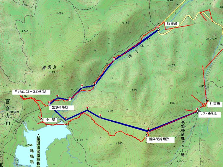 今回のコース 猫魔スキー場AM9:20〜リフト終点AM9:30滑降〜雄国山休憩舎AM10:30(休憩)〜ハッカ山山頂AM11:25〜 昼食11:55〜13:20〜沢下り〜檜原湖湖畔駐車場14:20〜猫魔駐車場14:35〜入浴〜郡山 戻る