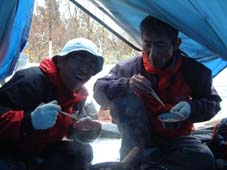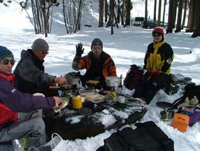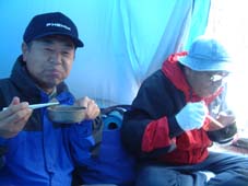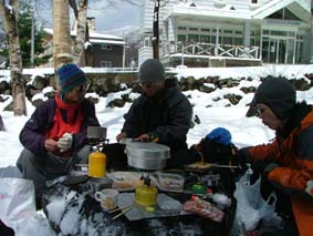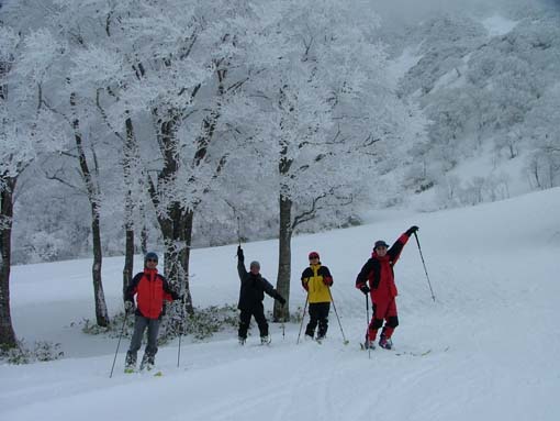 ![]() ゲートが開かない(MASAさん) ブナ林公園 雪の降る真夜中(テント設営)Joeさん ![]() ![]() ![]() テント内の温度が上昇レンズがくもる MASA〜AN〜Joe〜SEI ![]() 24日の早朝(ブナ林公園前) 冬眠から覚めたJoeとAN ![]() あら〜やっちまった (>_<) 新雪 ![]() ![]() ![]() 諦めて朝食を頂く(MASAさん特製サイコロステーキが美味しい) AN〜MASA〜JOE〜AN ![]() 鳥海山は雲の中 低気圧に巻き込まれ鳥海山のゲートでテン泊し翌日山頂を目指し巻き道を捜すが雪と悪路に 行く手を拒まれあいなく断念し撤退 日本海の荒波を眺め活きのいい刺身とお姉さんに元気つけられて月山に向かう しず温泉にある民宿いびすやで後続のOHG先生とojyou様を待つこと五時間 飲みつかれてうとうとしてるところに到着 笑いの中に宴会の始まり 明日は姥が岳〜湯殿山の山スキーを楽しむぞと意気込み眠りにつく 翌朝窓を開ければ外は深々と降る 雪 雪 既に30cmは積もってるだろう ・・・・・・ 帰り道タラの芽を頂くANさん ![]() ![]() 蔵王スキー場に移動ゴンドラにて地蔵山頂駅へ(合流したOjyou&OHG) Ojyou〜SEI〜MASA〜AN〜OHG〜Joe ![]() 季節はずれの寒波の落とし子(樹氷が綺麗でした) MASA〜SEI〜Ojyou〜AN ![]() 蔵王のツーショット MASA〜Ojyou ![]() ![]() ![]() 蔵王ゴンドラ駅の駐車場脇にて昼食の面々 23日の夕方郡山を出発 大斜面の鳥海山を滑降する姿を思い浮かべ張り切って出かける 雪のため 回り道を繰り返し矢島口の登山口に向かう なんと登山口10km手前に進入禁止のゲートがあり封鎖 24日夜中の午前一時 外は雪がしんしんと降り続く(テント泊) 翌朝(鳥海高原矢島スキー場から回り込むが悪路にて断念) 厚い雲に覆われた鳥海山方面を眺めて月山に移動 車窓より鳥海山を眺めるが麓しか望めず・・・・(>_<) 月山(しず温泉に夕方到着)外は雪 民宿いびすやにて25日の予定をたて宴会突入 (^O^) 25日朝食時に民宿の女将にシャトルバスの予定を聞くと 今日のスキー場までの道には積雪50cmで除雪のため月山スキー場までバスが 動くのは12時過ぎると・・え〜〜 ・・ ドハヤー 月山もペケかと (>_<) と言うことで鳥海山〜月山は低気圧に拒まれ会えなく撤退致しました 同じような方は居ませんでしたか・・・トホホ 相哀れむ (T_T) 帰りに蔵王スキ場にてゲレンデスキーを楽しんで来ました。 尚 鳥海山矢島口のゲートが開くのは28日との事でした |