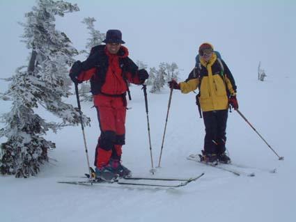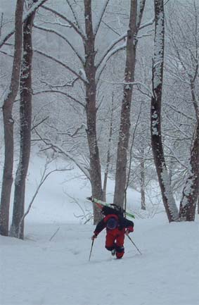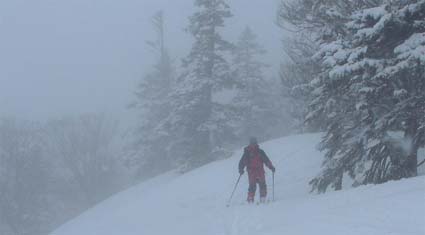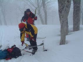 ![]() シールを貼り替えるAN右 最初の谷を登るAN&Ojyou ![]() ブナ&楢林を小雪舞う中の登り ![]() ANシールが利かず坪足で登る ![]() 前を行くOjyou(中央) ![]() ガスが架かり視界が利かない ![]() 2015m付近のAN&Ojyou ![]() 駒の小屋付近と思った場所でシールを外す が 手前のピーク2015mでした(駒の小屋は2053m) ![]() パウダースノを滑降する Ojyou & AN ![]() 振り返りシュプールを撮る ![]() 谷下りをする前に休憩のOjyou & AN 1350m付近 ![]() 夏道に架かる登山道の階段 小雪舞う南会津 登山口にはAM7:00シールを付けて出発 滝登山口には先行隊の車が一台(宇都宮ナンバーを見て もしかして東北MLの”まつおかさん”)違いました 天気予報は雨か雪 予報は当たり一日中小雪が舞う日に成りました 上の沢筋を登り尾根に取り付く此処は最初の難関 今日はシールが利き良い感じ しかし何かあるのが私達のメンバーANさんのシールが利かずスキーをザックに付け登る 抜ける雪面 進まぬANさん 尾根に出るのに四苦八苦 もうダメと大汗の谷登りでした 夏道と交叉する尾根1400m付近(テレビのアンテナあり)に付き小休憩 Ojyouの美味しいフルーツをパクリと頂く 此処までの時間は登り初めて2時間まあまあかなと!! これからの行程を確かめるため地図を眺める急登の連続にため息 フー頑張るか!! 斜面がきつく一度滑ると止まらない OjyouとANさんが やっと登った急斜面を転げ落ちる 止まらない こんな時はどうして止まる 方法は???とANさんが!! 1800m付近まで登ると先行隊のメンバー(登山口に在った宇都宮ナンバー)が下って来た 格好良くシュプールを描き 3名のスキーにボーダーが一名のグループ Ojyouが挨拶を交わす 話では森林限界までで引き返したと話される 同世代のメンバーと思うグループに Ojyouが私達は老人会の者ですと笑いを誘う 話に一時の交流を持つことが出来 別れた 森林帯を抜けるとホワイトアウトで方位がつかめない地図とGPSで位置を確認 駒の小屋付近と断定(所が手前のピークでした)記念写真を撮り下山 風が当たらない場所を選び食事にする ツエルトを張り雪よけを作る テーブルを作るためスコップで掘るが柄が抜ける 笑う 力が入らない(しゃりバテのSEI) 此処で体調悪いSEI足が痛む食欲が無い(リンク在り) 温かいうどんを美味しく食べるOjyouとAN コッヘルに分けて貰うが喉が通らないSEI 大好きなお酒も飲めない 美味しいとANさんがビールを飲む 40分位の休憩で滑降開始ザラメの上に10cm位の積雪 パウダースノーの斜面は 気持ちよくスキーが走る 右に左に急斜面を流れるように滑る格好良い二人の姿を 体調不良のSEIが後を追う ブナ林の間をこんなに気持ちよく滑れるのは めったに無い ANさんの一言 俺スキーが旨くなったね 其処でOjyou ん〜〜旨くなったね 雪質が良いからね・・・・・ 2015mから1500m位までは最高の雪質でした 下の沢に向かって下る谷筋は雪がクサリ急ブレーキが架かる 急坂の為 斜滑降で下る 滝の手前でトラバース 林道に出て登山口に向かう 林道は所々で雪崩があり危険個所が多い 夏道の登山道にある階段に着きOjyouの記念写真を撮り全行程を終えました しゃりバテのSEI 大変ご心配をお掛けいたしました Ojyouさん ANさん 懲りずに一緒に行きましょうね・・・反省・・SEIでした。 |
