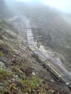 ![]() ![]() 展望台より白糸の滝 山の姿は雲の中 船明神山への登山口 ![]() 沢でワラビを採る 崩れた登山道(危ない) 沼尻温泉へ湯送菅 ![]() 白糸の滝(近距離より)・・・携帯電話カメラです ![]() 湯ノ花採取 元湯の祠 ![]() 元湯より湯送 旧元湯跡 午前中の講習会(救急救命)を終えて午後沼尻登山口に来た 雨の降る中 スキー場を通りゴロゴロした林道を進む 今日は安達太良山の山開き だが登山者には会わない 私達二人は途中山菜を採り登山口へ 階段の登山道を進み展望台へ ガスが架かり山の姿は無いが滝は鮮明に見えた なぜか引かれるように登山道を進むグングンと滝が迫る 滝まで来ると足が勝手に湯本方面へ 雨がしとしとと降る中 気持ちが晴れ晴れと天候と裏腹に 途中の湯送菅のジョイントから お湯がゴボゴボと沸きこぼれてる 手を差し伸べ湯に触れる 熱〜〜い 60°位は在るだろうか 惜しげもなく谷底へ流れる温泉 谷を流れる温泉は ゆらゆらと湯煙を上げ下流へと消える 崖崩れの跡を慎重に進む 今にも落ちそうな巨大な岩が足元をくすぐる 怖い Toyoさん 私は高い所と水は恐怖と意味真に話す 間もなく湯ノ花採取小屋に辿り着いた 硫黄の臭いがきつい沼の平らから流れ込む渓流は 大露天風呂と化していた 一組のハイカーに会う どちらまでと聞くと谷坪で温泉に浸かって来ましたと 顔を赤らめ体から湯気(これは大げさ ^^; )を出して下山してきた 湯本の祠に手を会わせ 旧湯本の跡で記念写真を撮り下山 途中で湯送菅の近くは温かいせいかワラビの育ちが早くヒョコヒョコと背丈比べをし 私達の山菜採りの手助けをしてくれました。 下山後 沼尻温泉に在る田部井先生のペンションに寄り温泉浴を楽しみ 美味しい生ビールで疲れを癒し今日の1日を終えることが出来ました。 Toyoさんありがとう・・・・SEI 戻る |