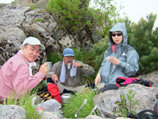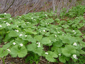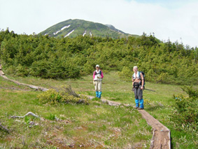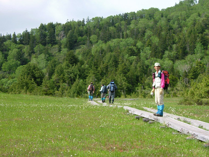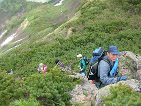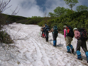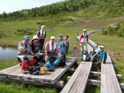 ←尾瀬沼 ![]() 尾瀬沼のワタスゲ ![]() テン泊のMasa&OHG 御池駐車場登山口に勢揃い (@_@) KEN・Hiromi・HIRO・HARA・TETU・SUMI・岡部会長・MASA・Tukasa・OHG ![]() 御池登山口分岐 いきなりの急登 広沢田代にてMasa ![]() 1900mピークより広沢田代 後方に燧ヶ岳(MASA&OHG) 池塘(熊沢田代) ![]() 熊沢田代の木道にて休憩 KAN・Hiromi・OHG・HIRO・TETU・SUMI・Masa・Tukasa・HARA ![]() 雪渓あるき 2100m登山道より熊沢田代 後方奥には会津駒ヶ岳 ![]() 元気なSUMI&TETU 柴安ーの切落ちた岩稜 ![]() ![]() ![]() ![]() 山頂の一時 HIRO・KEN・Hiromi・MASA・TUKASA・HARA・OHG MASA・SEI・HARA・TETU・SUMI・HIRO ![]() 山頂で〜〜す ![]() 下山 奥に尾瀬沼 中央にミノブチ岳 ![]() ![]() 岩場を下る 振り返り燧ヶ岳のピーク ![]() ミノブチ岳にて KEN・SUMI・TUKASA・SEI・Hiromi TETU・MASA・OHG・HIRO・HARA ![]() ![]() サンカヨウ キヌガサソウ(拡大) ![]() 途中に岳樺の倒木が ![]() 沼の平 御池駐車場にテン泊した3名 檜枝岐の民宿に3名 早朝組5名 の総勢11名の参加 早引き(会長は早く帰る)1名は尾瀬沼を探索後帰宅と各自のコースを設定した 6月例会登山(幹事HIRO)の幕開けでありました 夜間はテントに激しく叩きつける雨 明日は雨の中の登山とテントの中で!! 早々とMASAが起床 モーニングコーヒと外で独り言 聞こえるが起きないOHG&SEI 6時にムクムクとテントから出る二人 雨は止み爽やかなあさである フキの葉が雨に濡れて瑞々しい 鳥のさえずる声が朝靄の空気を振るわし響く キツツキの幹を打つ音が朝の目覚ましと成ったテン泊組の夜明けです 準備を整えて駐車場のカウンターの取り付けてある登山口を渡ると ブナの巨木が目立つ岩がゴロゴロしてる 直ぐに湿原がありミズバショウの大きな葉が所狭しと群生していた 登山道は雨上がりの為か悪路で滑る 木の根に上がり靴を滑らすOHGさん あぶない〜〜 と (>_<) 一時間ほどで広沢田代に着き一休み ワタスゲやイワカガミ・タテヤマリンドウ・チングルマなどが 咲き(まだまだ咲いていたが名前が解らない)行き交う登山者の目を楽しませてくれる 目の前のピークを越すと燧ヶ岳の全貌と熊沢田代が現れるはずである 蒸し暑い汗がわき出す拭っても拭っても汗!! 当然の如くビールを取り出しグビィーと喉奥に流し込む はらわたまで通る清涼感 これが堪らない道草の微笑みは至福の一こまでした 木々をくぐり抜け現れた湿原 奥には3筋の放射線状に雪渓が残る燧ヶ岳!! 西には越後の名峰が連なる 北に会津駒ヶ岳 東には田代山〜帝釈山と展望を追う 目の前に池塘 風に誘われゆらゆらとワタスゲ 池ではカエルが合唱する 小さな魂が語りかける 心を開き自然に戯れ 湿原の持て成しを堪能致しました 木道を渡りきるとダケカンバと笹藪が入り込む道に 目先には先ほどの雪渓が現れ階段状に 掘られた跡を確実に登る 道標のある小さな空間で振り返る!!眼下には熊沢田代が輝きを放してた ゴツゴツした大岩を登ると山頂に着いた 山頂では20人位の登山者が時折吹く強風に キャーキャーと帽子を飛ばされての悲鳴でありました 山頂の展望はガスが次々と流れスライドを見てるように景色が移り変わる 至仏山〜尾瀬ヶ原〜尾瀬沼〜等が見え隠れする様が不思議と心に写り感動するのでした 休憩を楽しみ長英新道を下る 途中ミノブチ岳で記念写真を撮る 下山道には花々が群生してる 大きなダケカンバの倒木 なが〜〜〜いくだりを終えると尾瀬沼が ワタスゲの白が木漏れ日に照らされ沼一面に散りばめられた宝石の輝きに魅える。 沼の平を足早に沼山峠へ 峠の休憩所は登山者の憩いの場所として開放されて居た 当然の如くビールを求めて噴き出す汗を拭こうともせず飲むSEI 間もなく全員下山 燧の湯で浸かり立ち蕎麦を食べ帰途に着く 参加者の11名の皆さんありがとうございました ・・・SEI・・・ 戻 る |