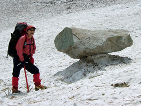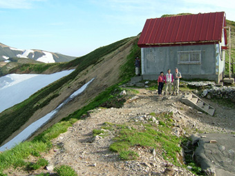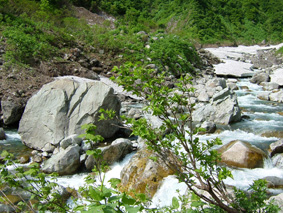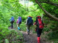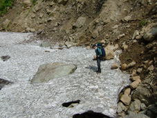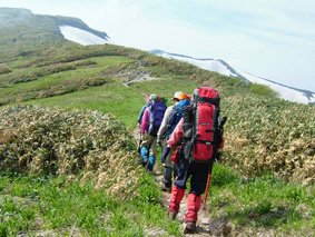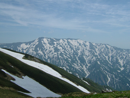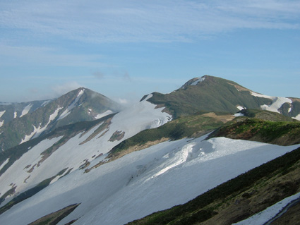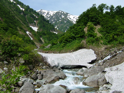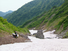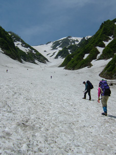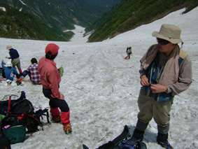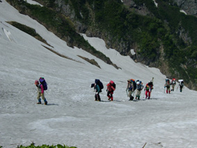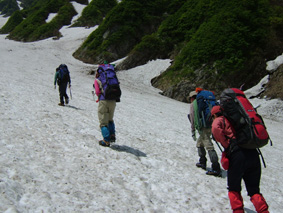 ![]() 石転び沢の全貌 左から Masaさん TANさんは初めての石転び沢(憧れの山) ANさん すかがわ2嬢さん ![]() 温身平(後方稜線は梅花皮〜門内) TAN・AN・Masa・Ojyou ![]() 朝食(AN・TAN・Masa)Ojyou提供写真 (@_@) ![]() ![]() ![]() 砂防ダム〜緑が濃くなった登山道〜下つぶて石 ![]() 梶川の出合いで一度は雪渓に乗るが?? ![]() ![]() ![]() 空洞のスノーブリッジ 〜 直ぐに夏路に取付く 〜 上つぶて石 ![]() 石転び沢(中央に大岩) 例年になく緑が濃く見える幸七尾根(中央 宮城の山仲間・Ojyou・AN・TAN・Masa (^O^) 良い天気だない ![]() ![]() ![]() 足取りが重い 斜度が増す沢 浮き石とじゃれるOjyou ![]() 幸七尾根の岩盤に張り付く木々 ![]() 点々と人影が石転び沢を!! 上を見上げると梅花皮岳方向より落石が 凄い勢いで転がって来るのが見えた 直ぐにラークと大声で数回叫ぶ 落石の転がる方位に二人のスキーヤーが居る 気づかない 又 大声で叫ぶ 気づいてくれた 慌てて二人が落石を避ける 一人が転倒する スキーが外れスキーアイゼンも外れずれ転がり落ちた が 直ぐに止まり 事なきをいた 石転び沢で未だに落石が無かった事は無い (@_@) 十二分注意をしたい。 ![]() 中之島にて休憩 いよいよ最後の昇りMasa〜AN〜Ojyou〜TAN〜宮城の山中間 ![]() 梅花皮小屋から大日岳 ![]() 梅花皮岳 梅花皮小屋 SEI〜TAN〜Masa(下段にAN〜Ojyou) ![]() ![]() 北俣岳山頂で TAN〜Masa〜AN〜Ojyou〜一人気取って^^;SEI(後方は大日岳) ![]() ![]() ギルダ原を行く 梅花皮岳&北股岳 ![]() ![]() ![]() ![]() 門内小屋にてOjyou・Masa・TAN・AN (AN&Ojyouのお笑いが始まる) ![]() 赤い屋根の門内小屋 日本海に落ちる夕日(なぜか寂しい) ![]() 二王子岳に夕日が射し込む 金曜日(4日)のPM7:00郡山を出る 喜多方〜小国〜飯豊山荘登山口へPM10:30頃に到着 早々テン泊の準備 夕ご飯&宴会を早めに切上げ眠りに付く 5日AM5時起床 朝食は砂防ダムで取ることにして出発 朝から日射しがある天候に足取りも軽い 新緑のブナ林を進み 登山道に咲く花を鑑賞 温身平より飯豊の峰を覗き渓流の流れに送られ砂防ダムに着いた 清々しいマイナスイオンが体を包む 無尽蔵に湧き出る自然の宝庫 飯豊連峰の恵み 憧れの飯豊(石転び沢)にMasaさんTANさんが訪れた 食事を済ませ階段のある砂防ダムを登り登山道に取り付く 満タンに貯めたダムの清流は青く 形相が底まで透き通り見える 贅沢な持て成しを受け梅花皮沢の夏路を登る 去年の事故はこの辺かなと小さな滝が流れ落ちる場所で呟く”合掌” いつもなら雪渓歩きをする梶川の出合い スノーブリッジもなく勢いよく流れる雪解水 滑る岩を慎重に渡る ANリーダーが手を差し伸べ無事に渡ることが出来た 門内沢の出合い手前で雪渓に取り付きようやく雪の感触を味わう 大岩は背丈以上に露出して いつもなら腰を下ろして休憩する場所が見上げる位置に遠ざかる(大げさ) 所々には大岩を思わせるような巨岩が頭を出していた 出合いで休憩をして ・・さあいよいよ石転び沢の本領発揮 近くに見えて届かない梅花皮小屋へ登坂開始 雪が腐り適度なカットが歩きやすい 本石転び沢付近に大きなダケカンバの倒木が休んでいた 自然の力は凄い 幹回り1m以上はあろう巨木がバリバリと むしりちぎられた様な断面に驚く ギョ @_@ 中之島で休憩 最後の踏ん張り 胸突き八丁の急登を感激深く登る 一歩一歩 之が石転び沢 之が無ければただの沢と言い聞かせながら いつもの味わいを今年もありがとう 石転び沢・・・・SEI 梅花皮小屋にメンバーが到着 小休憩後 北股岳〜門内小屋へと足を運ぶ 途中お花畑の解説(Ojyouさんの)を聞きながら 見事に咲き誇る花々に飯豊の夢を頂き小屋に到着 夕日が沈む様 落日を浴びる二王子岳を眺め小屋に入る 小屋には宮城で(不忘山 山スキーで出会った方)知り合った先客と秋田の登山者の二組 其処に私達5名&途中からご一緒に仙台の方1名 後から新潟山岳会のメンバー8名??が合流 宴会の席が出来上がりました 食事を済ませ 小屋のメンバーは一体になり山談義とAN&Ojyouのお笑いに終始致しました。 午後8時 5日の全行程を終了 門内小屋の閉店と成り心地よい疲れ 爆睡する闇夜に静けさが宿りました ・・・時々 歯ぎしりがあり・・・・6日の門内岳〜丸森尾根に続く ” SEI ” (^_-) 戻 る |