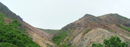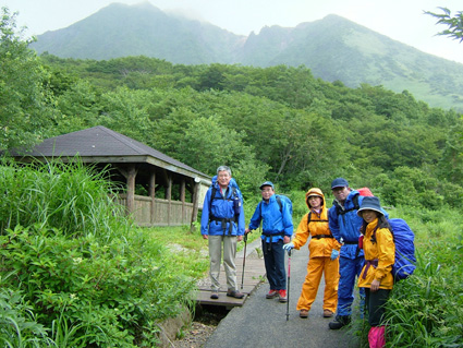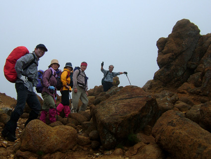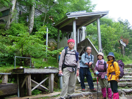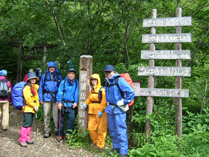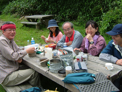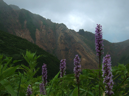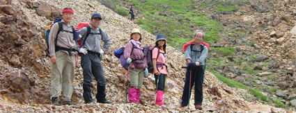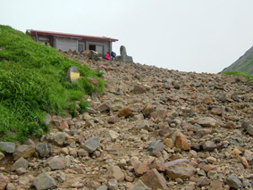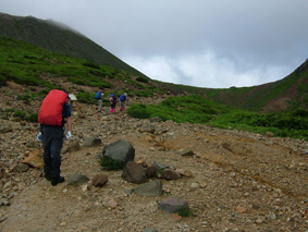 ![]() 峠の茶屋駐車場にて 登山道入り口 TAN・TAKE・FUKU・AN・SIN 後方は朝日岳 ![]() 道標前 SIN・TAN・TAKE・FUKU・AM 朝日岳の稜線 ![]() 茶臼岳と朝日岳のコル 剣が峰(ガレバの荒々しい姿) ![]() 鬼面山(笹が醸し出す山肌) ![]() 朝日岳へ 途中のガレバ AN・FUKU・SIN・TAN・TAKE ![]() 右奥 茶臼岳 クサリ場 ![]() 隠居倉へ 稜線の花と TAN・TAKE・ANSIN (^O^) FUKU ![]() 赤い岩肌の山容(剣が峰) 三斗小屋温泉(源泉の湯煙) ![]() 三斗小屋温泉 TAN・TAKE・FUKU・SIN ダケカンバの登山道 ![]() 延命水にて喉の乾きを潤すメンバー TAKE・FUKU・AN・TAN・SIN 那須ウスユキソウ??(>_<) 無間谷に架かる橋 休憩でゴザル ![]() 那須岳避難小屋 峰の茶屋への登り TAN・AN・FUKU・SIN・TAKE ![]() 峰の茶屋避難小屋 下山後峠の茶屋にて TAN・SIN・TAKE・FUKU・AN 10日PM3時頃から郡山地方は大雨にて道路が寸断 冠水による被害が出始めた SEIの所も浸水 (>_<) 被害が出る が !! (*^_^*) そんな中 早池峰山登山の為 PM7時集合 ANさんだけが遅れる (郡山への道路が渋滞 1区間が通常の時間の5倍係り到着) 幹事のTAKEさんが早池峰山登山の中止を決める(高速道路通行止めや道路冠水の為) と 同時に今日は宴会をしようと提案 皆さん思いも寄らぬ展開に大喜び(特にANさんの喜びは特大・・・^^; ) SEIの事務所は屋根を叩く雨音をBGMにお泊まりコースのチャンチキオケサ6名の参加者が 飲めや○○やで大騒ぎ豊富な飲み物(お酒・ワイン・どぶろく・ビール・焼酎 等)で盛り上がる 終宴は草木も眠る丑三時 誰ともなくシュラフに潜り眠りに付く 翌朝 5:30分起床 宴会の中で決めた那須岳(今回の命名は那須早池峰山)に向かう 皆さんうつろな目に気合いを入れて車に乗り込む 運転は若いお嬢様(男性は二日酔い)SIN殿である 運転は任せなさいと言うだけあり さすがの腕前 流れるように走るワゴン車は一時間半くらいで那須登山口に到着 那須早池峰山の登山開始と成りました 雨の降る中 石段を登り登山口の道標で記念写真 ガスが漂う峰 茶臼岳は雲の中 朝日岳は見え隠れ 時折吹く突風に小石混じりの洗礼を受ける 山は雨にも係わらず登山者が多い 雨具に身を包む人 Tシャツの軽装で登る人等 華やかだ 峰のコルは風が強く 飛ばされそうに成り剣が峰へと進む 右はガレバの急斜面 左は今にも落石が起きそうな岩場 慎重に朝日岳の分岐に向かう クサリ場は頑丈に固定されたクサリの為 歩きやすい 登りきるとコルの分岐 山頂には行かず隠居倉に向かう 途中の道には紫の小さな花が咲いていた 間もなく熊見曽根の分岐に着く 登山者が寒そうに雨具で防寒 食事をしてる姿が印象に残る 私達は休まず分岐を下り稜線に出た 所々崩れた道 落ちれば痛いだろうな〜と独り言 (?_?) 強風に踊る雲間から覗く峰 剣が峰の一角は荒々しく雄々しく雄大に映る 隠居倉のピーク手前に紫の花が群生してた(花の名前教えてください m(_ _)m ) 花の楽園にしばし足を止める 綺麗な花には美男美女と記念写真を撮る 目の前に隠居倉のピーク 賑わいを見せる那須岳も こちらのコースは単独登山者が一人だけ 静かな山あるきになる 雲の中に隠れた流石山〜大倉山〜三倉山を遠目に三斗小屋温泉に向かう 小屋手前の源泉からはモクモクと湯煙が上がり硫黄の臭いが漂う 足早に下る 三斗小屋温泉で温泉に浸かるためである 所が・・・・(>_<)・・・・(;_;)・・・・今までは登山者が休憩して入浴を楽しめる場所として 親しまれた三斗小屋温泉が 休憩入浴お断りの看板 之にはぶったまげた入浴お断りときたもんだ!! 幹事のTAKEさんが小屋に居た人に聞く 入浴をお願いしたいのですが と ・・・ すると味気ない返事 ダメデス 数年前に来た時は登山者で賑わいを魅せていた小屋 宿泊者以外 お風呂も・休憩も・トイレもダメと立て看板 世の中どうなってるのと私達は呆れるやら怒りやらで小屋を後にしました 今後はこのコースはもう来ないと全員の合い言葉になる 沼原の分岐を過ぎると延命清水に着く 怒りを押さえ渇いた喉を潤し清い心でダケカンバの道を進む 那須避難小屋から望む茶臼岳を記念に撮り最後の登り ザレ場の道!! 木々の生い茂る登山道から岩が露出した道へと変わる コルに近づくにつれ風が強く小雨交じりの天候に鳥肌が立つ 寒い 峰の茶屋に入るが 休憩は取らず直ぐに下山 峠の茶屋のテーブルで遅い昼食 冷えたビールでご苦労様と乾杯 温かいラーメンとみそ汁が空腹の体を温める このアンバランスの食事がバランスがとれ何とも微笑ましい光景でした 下山後 大丸温泉露天風呂で長い入浴タイム 風呂上がりのビールで仕上げ 今回の那須早池峰山登山が完結致しました 思いも寄らぬ大宴会 那須登山変更 紫の素敵な花の群生 三斗小屋事件 等 大きな収穫が ありました TAKE幹事 ANさん TANさん FUKUさん SINさん ありがとう また宴会が出来ると良いですね ・・・・・SEI・・・・ 戻 る |