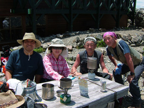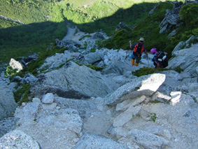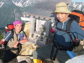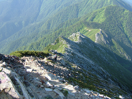 ![]() ![]() 常念岳 前常念岳の稜線 ![]() ![]() ![]() ![]() ![]() ![]() ジャンダルム〜前穂高岳〜奥穂高岳〜唐沢岳〜北穂高岳〜大キレット〜南岳〜中岳〜飛騨乗越〜槍が岳〜東鎌尾根〜西岳〜赤岩岳〜大天井岳 手のマークで拡大 ・・・・・・・・・・・・・・・・・・・・・・・・・・・・・・・・・・・・・・・・・・・・・・・・・・・・・・・・・・・・・・・・・・ ![]() 日の出(常念岳より) ![]() 出発前のSho&SEI 朝焼けの槍 常念岳でSho&TETU ![]() 奇怪な岩の前にてSEI〜SHO ![]() 蝶への道(稜線) ![]() 稜線のガレバ 振り返り常念岳 蝶が岳ヒュッテの前TETU〜岐阜の山遊隊二人〜SHO ![]() 岐阜の山遊隊の皆さんと共に ![]() 蝶が岳ヒュッテ(後方 槍の遠望) 下山前の分岐にて(岐阜の山遊隊の皆さん) ![]() 下山途中(まめうち平)SEI&Sho ![]() 道中のお花さん 二日目の目覚めは3:45 蝶が岳への稜線歩きの為 暑くならないうちにと4:15分には小屋を後にした 常念乗越のガレバは急登 朝一の登りは大変である 日の出を眺めながら ゆっくりと登る 山頂は既に数人の登山者が居た 小屋で頂いた朝食の弁当を熱いみそ汁を作り 360°の展望を追い頂く贅沢は山に来た者にのみ 与えられる祝福の時間であると思う ”感謝の時” m(_ _)m 目の前にある峰は 夢ではなく 写真でもなく スライドでもない まさしく北アルプスの全貌である 朝食を終えた私達は岩峰の急坂を下る 遠くに見える蝶が岳ヒュッテ 蝶槍の勾配は 常念乗越を思わせる傾斜だ 時折吹く微風に汗ばんだ体が心地よい稜線歩き 楽しんで 山を歩く そんな時に流され蝶槍に着いた 途中のお花畑やコメツガの林は 癒しとエネルギーの補給地を演出してくれる優しさがある 蝶槍から蝶が岳そして蝶が岳ヒュッテは直ぐ其処に見える 稜線は小さな石の平地で此処から先は楽に歩けヒュッテまでは40分足らずでした ヒュッテのビールは (~o~) 自販機で冷やされていて冷たく美味しい TETUさんにご馳走になり 美味しさが一段と増した TETUさんご馳走様でした テーブルで休んでいると岐阜の山遊隊の皆さんと意気投合 話が弾む 元気の良い6名のパーテー 稜線歩きでも抜きつ抜かれつでお話や挨拶をしたため おなじみのお顔でした 東北の山に来た時があると聞き 今度来るときは連絡下さい 等と互いに約束 記念写真を撮り下山を私達が先行し別れた・・・・またお会い致しましょうね・・・ 下山は森林歩きである 展望は殆ど無くただひたすら下りるだけ そんな登山道で目を引くのは白い可憐な花 ”オサバグサ” である 山肌全体を白く塗りつぶした様に敷き詰められた花 オサバグサ!! 鈴なりに小さな花が傘をつぼめたように上から下い広がりを持ち付ける花 見事に咲いてる 控え目な花オサバグサが展望のない登山道を彩る 休憩を取らず下山した為 2時間10分で駐車場へ到着 三俣の分岐にて手を会わせ安全に登山を終えた事に感謝!! 8年ぶりの常念岳〜蝶が岳登山に新しいページと出合いが出来たことで 山あるきに教えられる無尽蔵な喜びと感動を憶える 大坪さん山遊隊の皆さんShoさんTETUさん ありがとう ・・・・・・・SEI・・・・・・・ 戻 る |